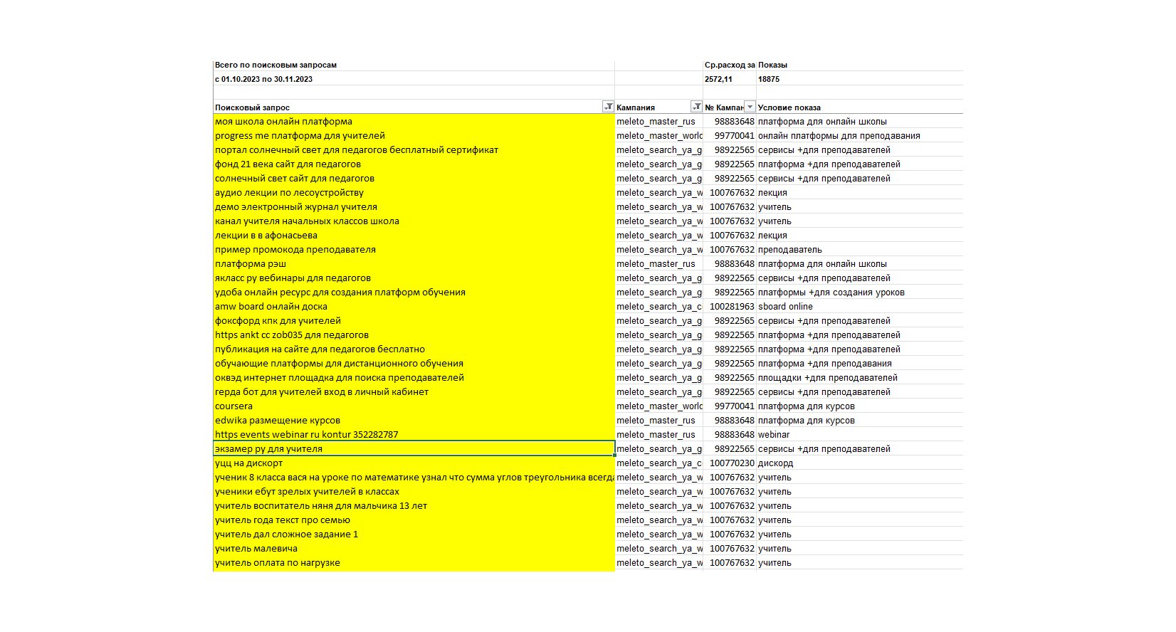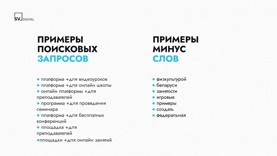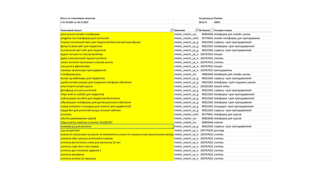 В списке минус-слов отсутствовали общие фразы (например, «учитель», «вебинар», «образование»). Из-за этого рекламу видели даже те пользователи, которые не нуждались в онлайн-платформе для преподавания. Как результат, почти 16% бюджета (6 230 рублей) было потрачено впустую.