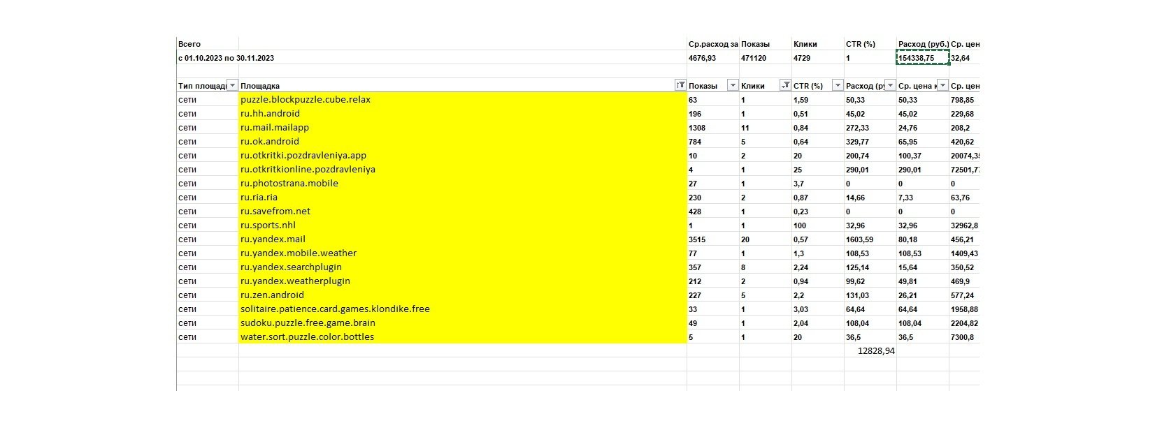Из-за отсутствия грамотных настроек реклама в РСЯ показывалась в играх, развлекательных приложениях и на других нерелевантных площадках. Т.е. около 8% бюджета (12 828 рублей) было израсходовано на нецелевые показы.