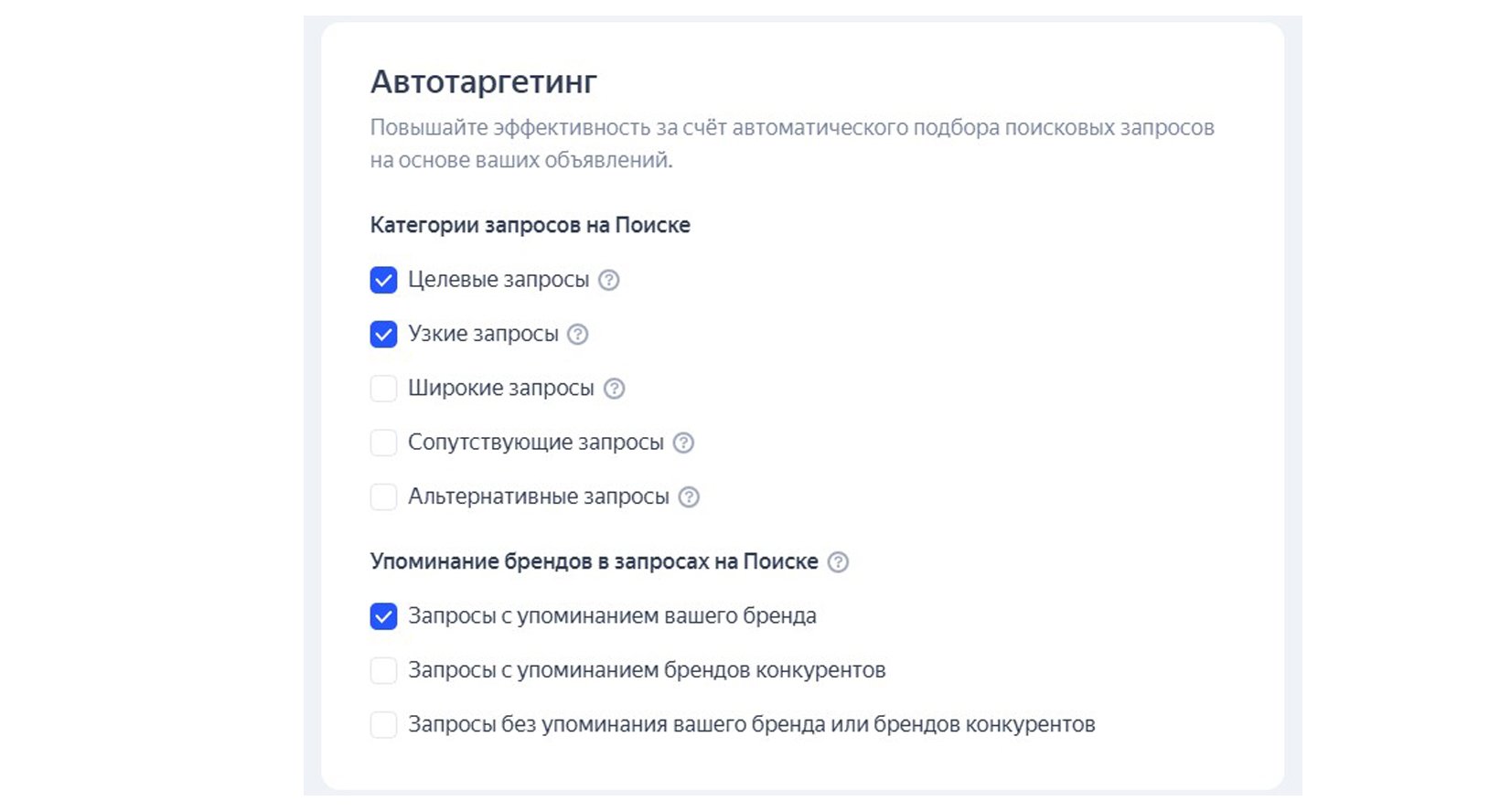 В настройках РСЯ был включен автотаргетинг, т.е. система сама определяла интересы пользователей и делала это неправильно — широкие и дорогие запросы быстро «съедали» бюджет, не принося регистраций.
