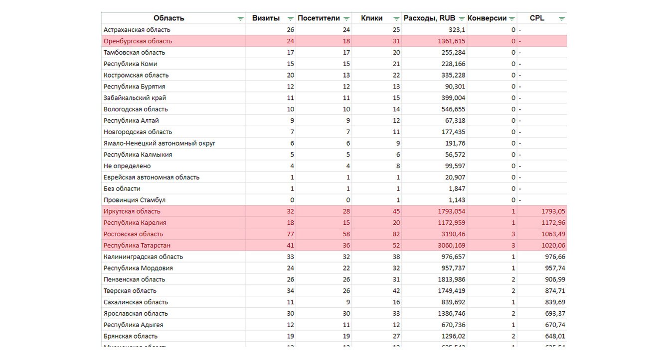 — проанализировали эффективность геотаргетинга и отключили показы в регионах, где стоимость лида превышала 1000 рублей или не было конверсий;