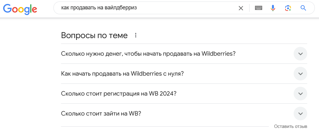 Это то, что поисковик добавляет к основным результатам выдачи по основному запросу. Например, в теме «как продавать на Вайлдберриз» среди вопросов по теме, которые выдавал поисковик, были еще и «сколько нужно денег, чтобы продавать на Вайлдберриз». В статьях у конкурентов этот момент не был затронут, но раз пользователи ищут эту информацию довольно часто, такой раздел мы также включили в своё ТЗ.