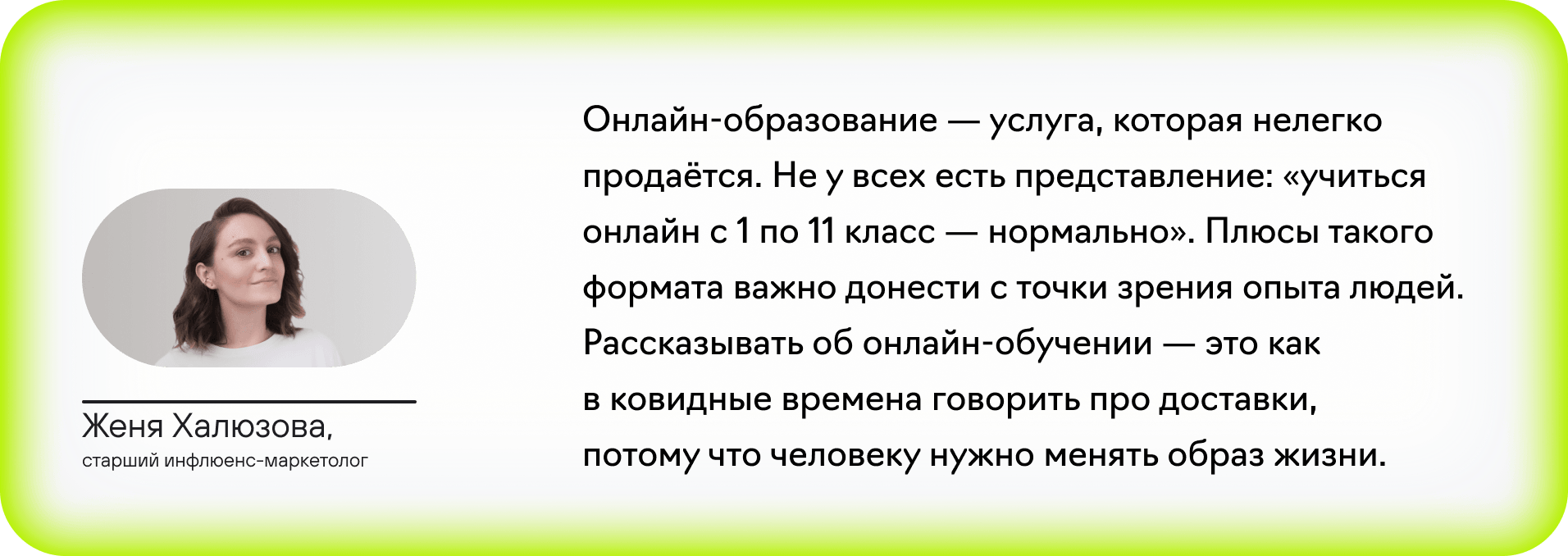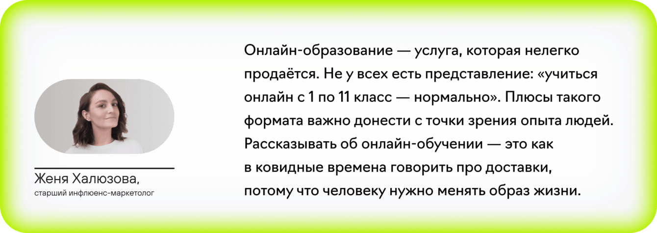 Необходимо было показать родителям, что онлайн-образование — это нормально, через реальные кейсы и жизненные ситуации. А детям донести, что онлайн-школа — это современно и даёт возможность посвятить себя карьере, творчеству или спорту.