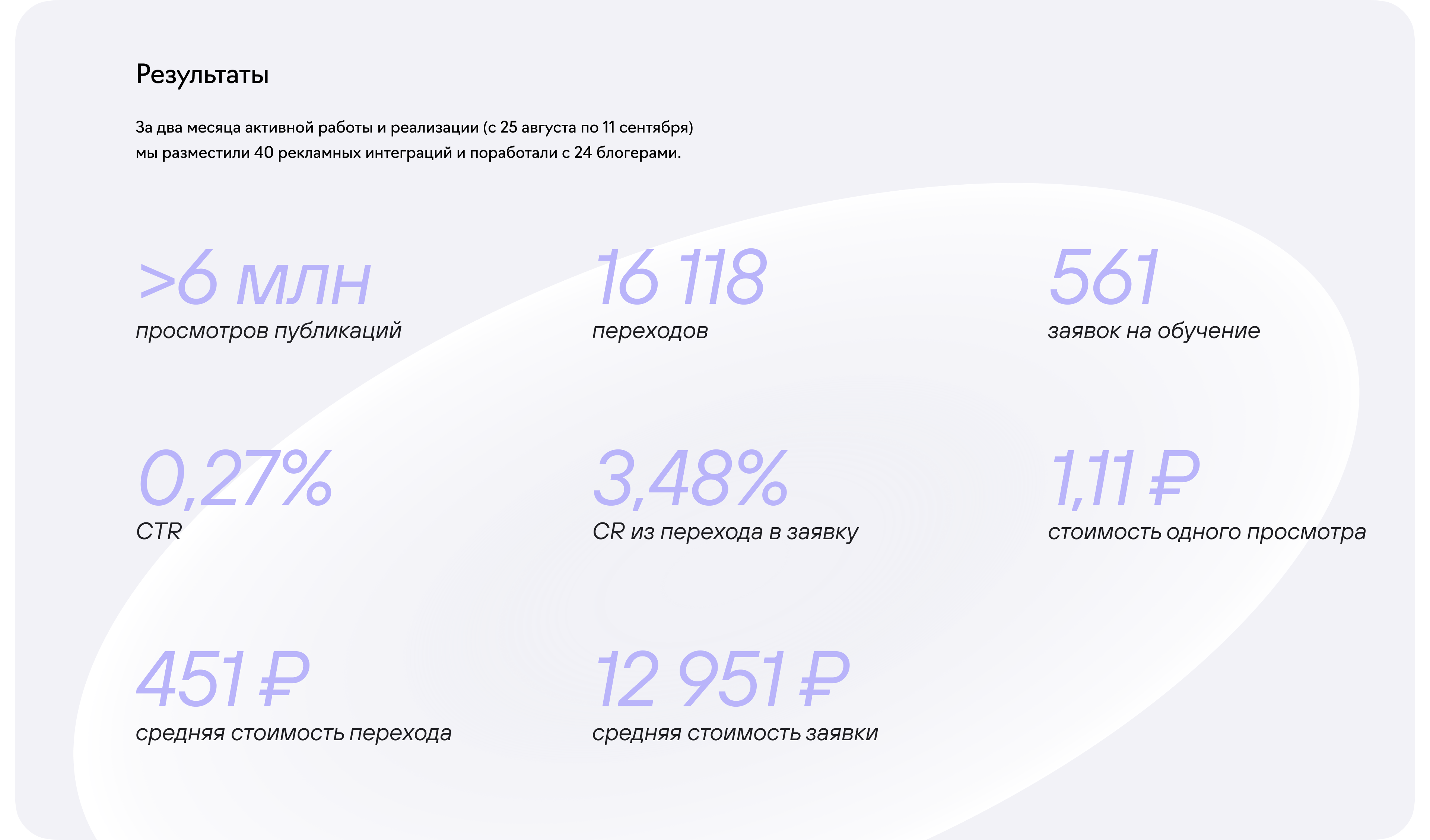 Основная сложность была в сжатых сроках: реализовать кампанию по рекламе у блогеров нужно было с 25 августа по 10 сентября. Как мы это реализовали — рассказываем в кейсе рекламы образовательных услуг.
