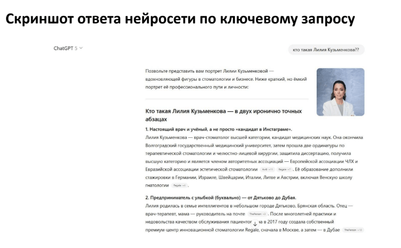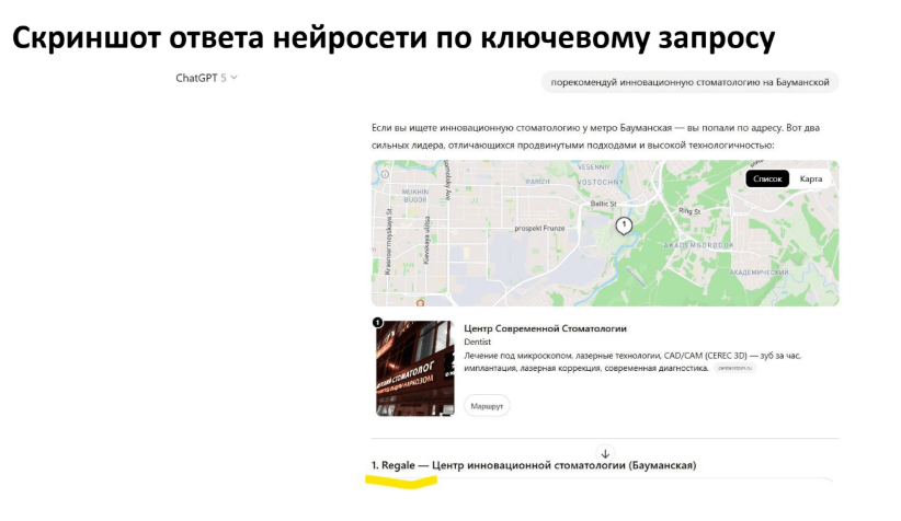 Присутствие в нейросетях: при запросах «инновационная стоматология» ChatGPT и Perplexity упоминают центр и его экспертов.