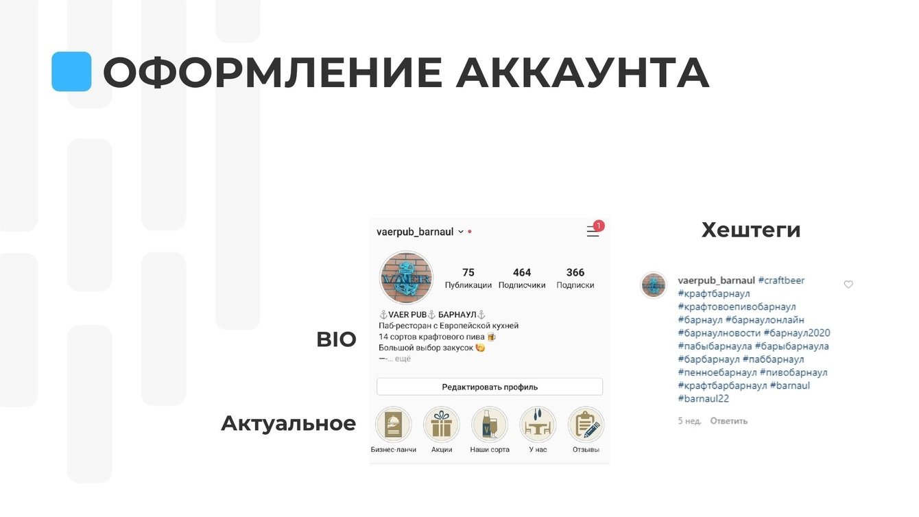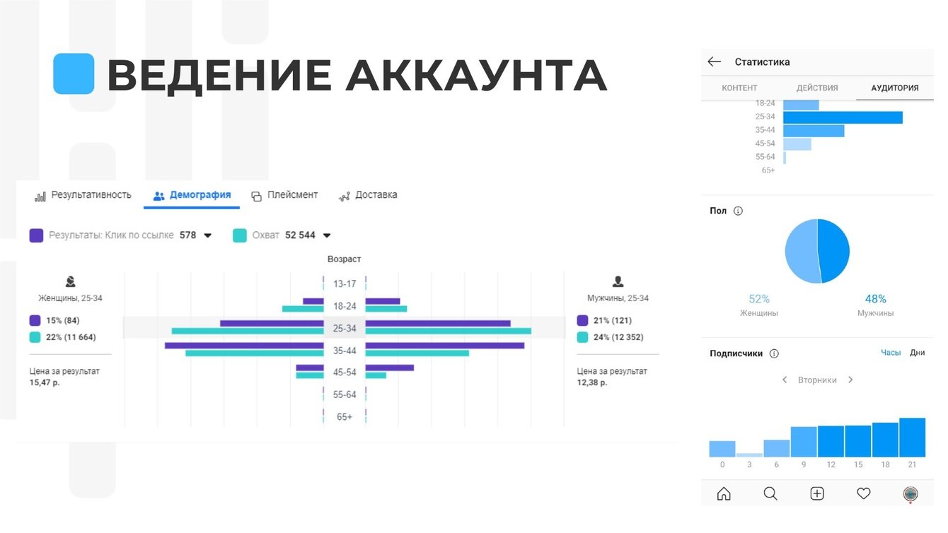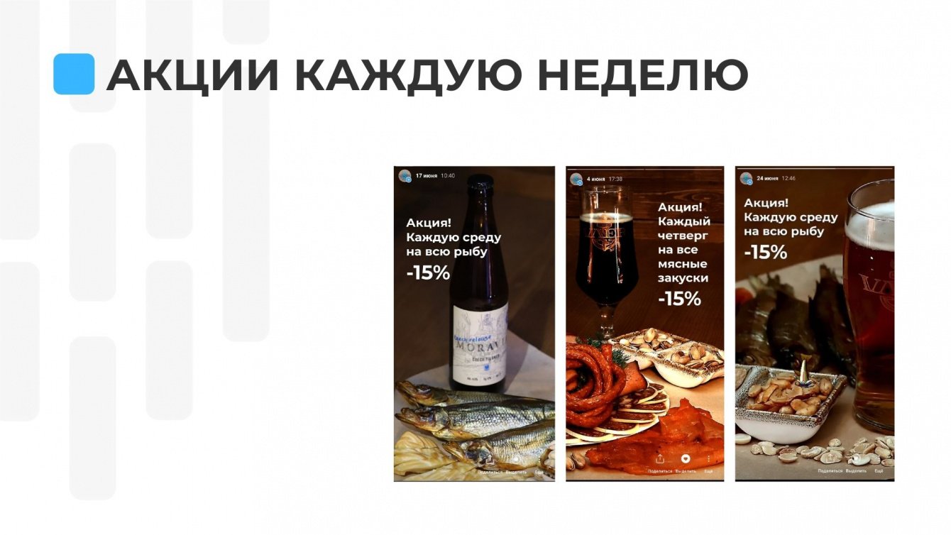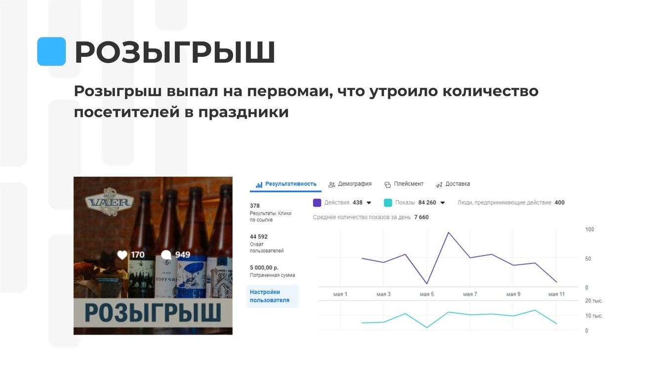 Контент направлен на вовлечение взрослых людей среднего достатка. Во время карантина эти люди не могут посетить паб, поэтому мы старались создать виртуальную атмосферу уютного пространства и вкусного пива, чтобы побудить их приехать и попробовать. Огромным плюсом для нас было то, что конкуренты приостановили постинг во время карантина, потому что не успели перестроить магазины. Мы воспользовались этим и создали облако хештегов, по которому пост могли увидеть до 30% новых пользователей не подписчиков аккаунта. Срез по демографии в вовлеченности в рекламу и контент.