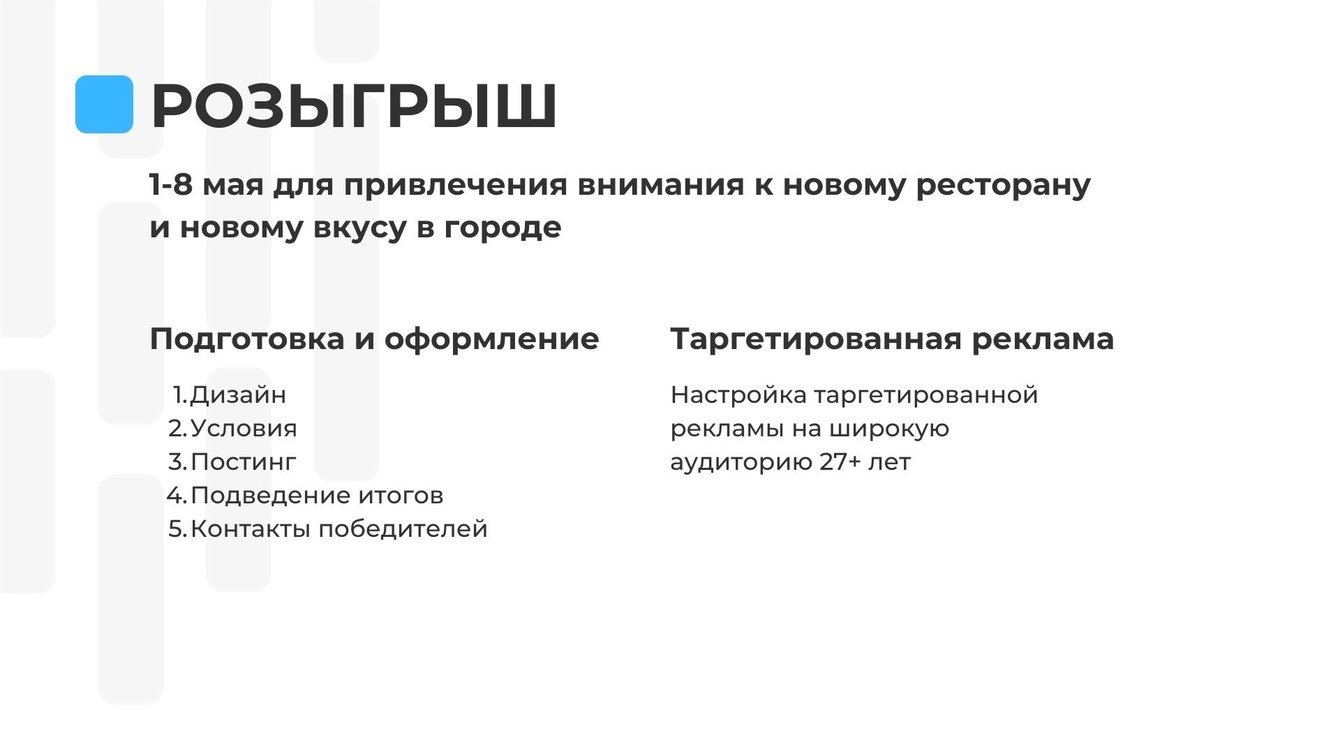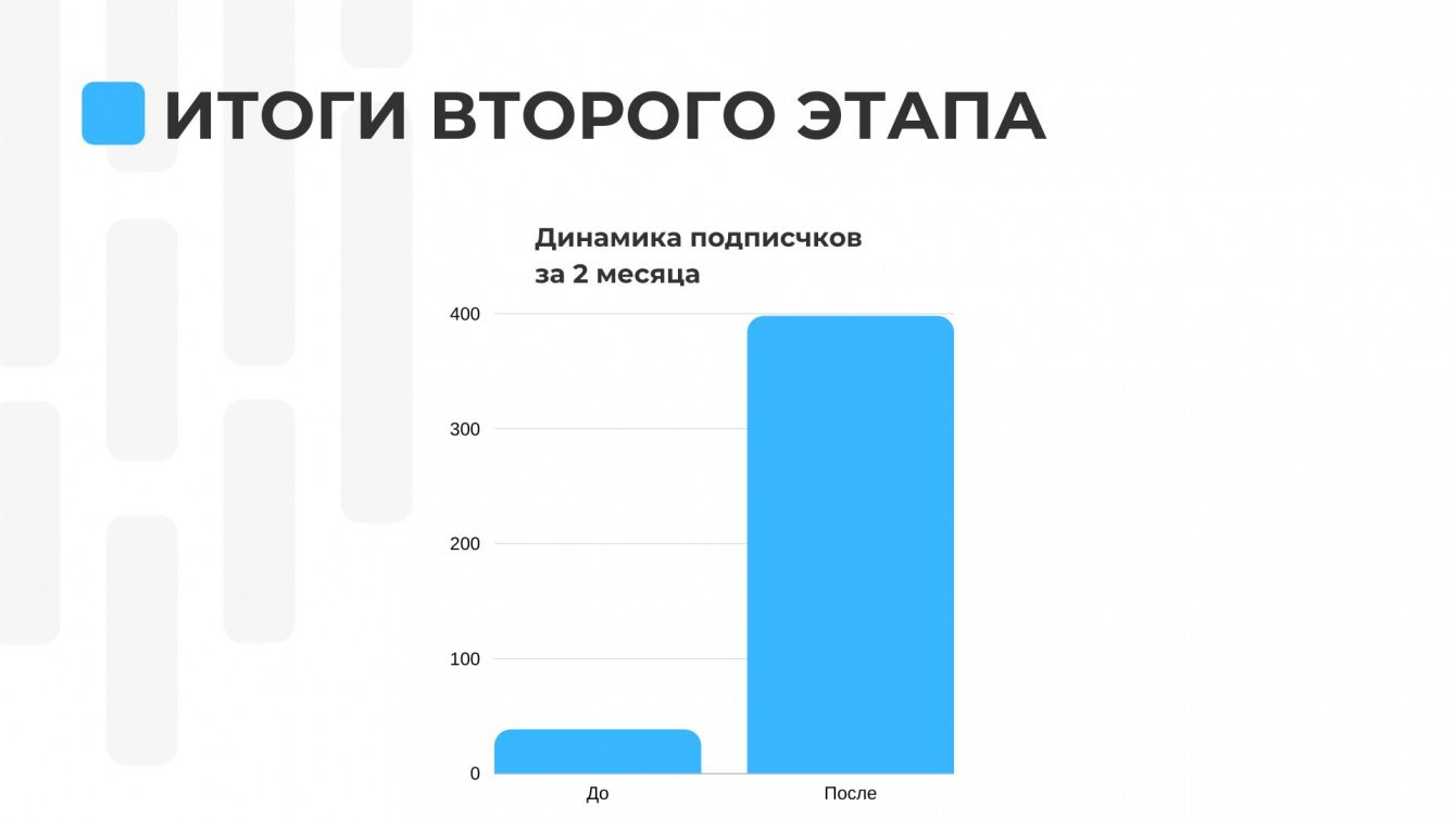 Во второй месяц удалось запустить доставку и получать заказы из социальных сетей на доставку бизнес-ланчей. Удалось увеличить средний чек благодаря системе скидок. Наши сотрудники сделали 2 контрольные закупки за месяц с помощью тайных покупателей. В итоге мы составили карту путешествия клиента, где выявили все + и - бизнес-процессов, что очень важно на старте.