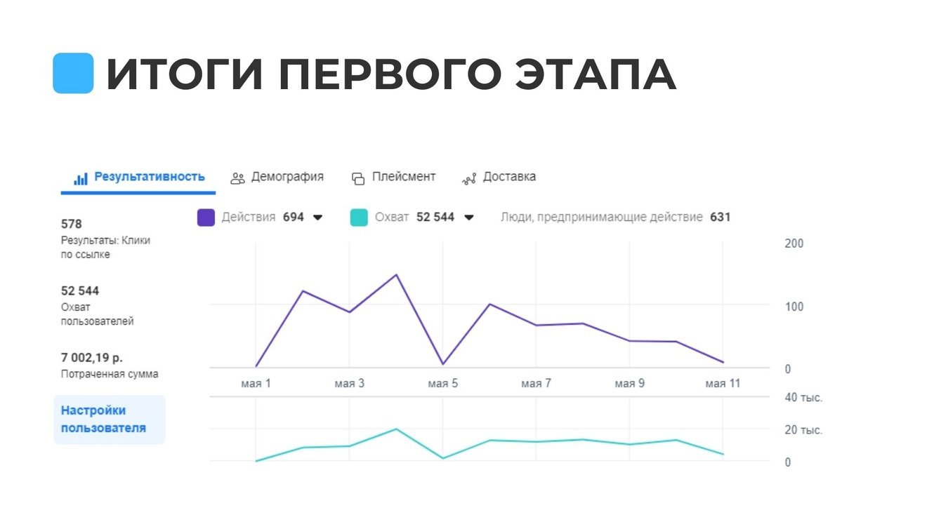 3. Общий охват рекламных компаний составил 52 544 человека. Таргетированная реклама, направленная на расширение узнаваемости, привела новых клиентов.