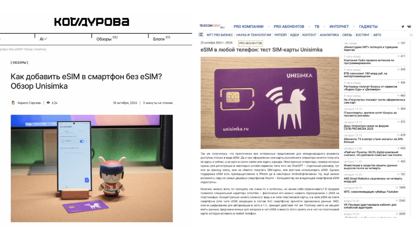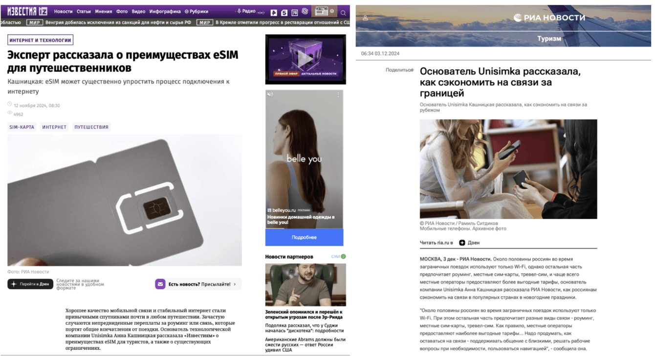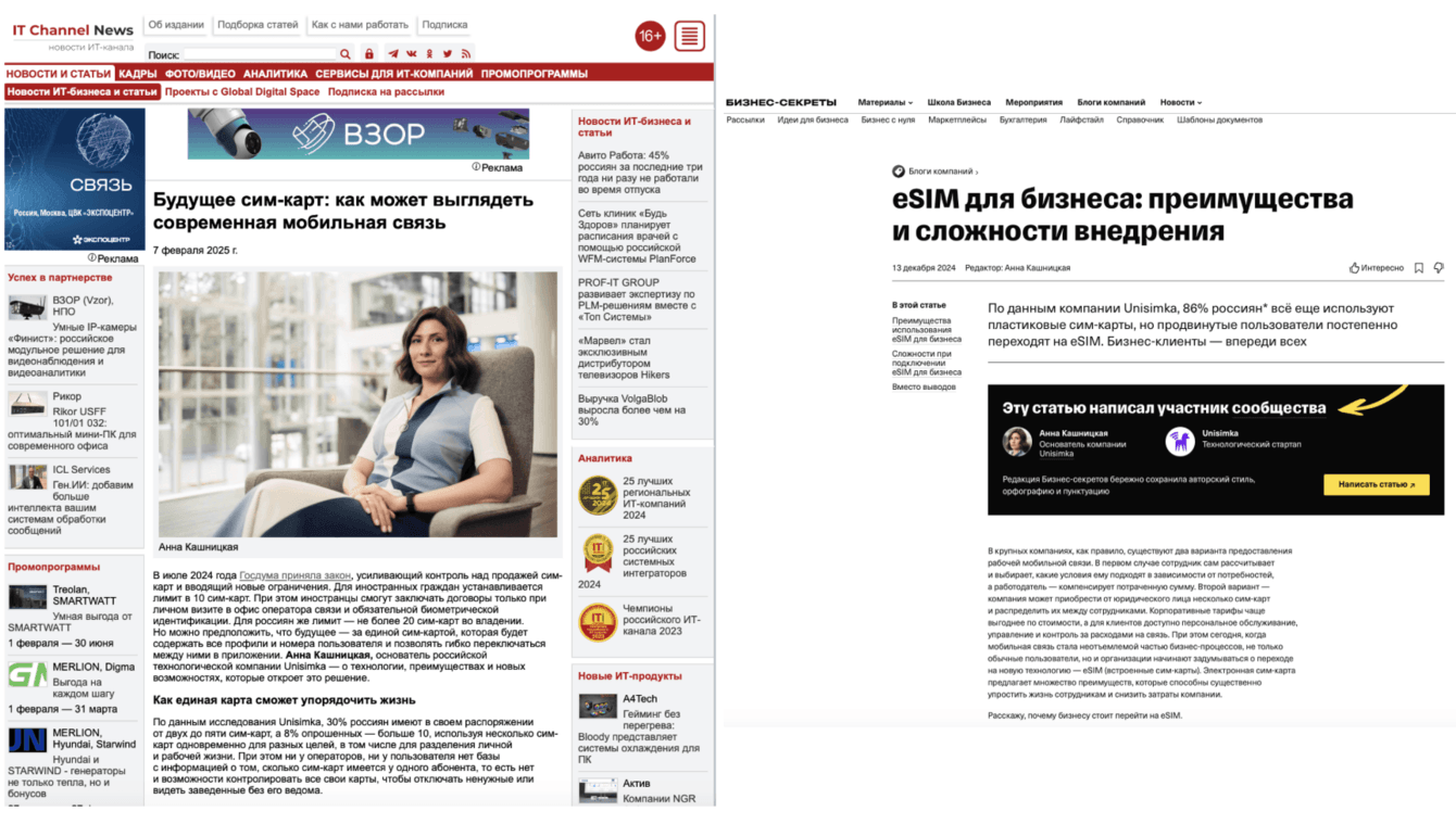 Мы также инициировали работу со СМИ из tier 1 и tier 2 по экспертным колонкам от лица основателя проекта Unisimka Анна Кашницкой, чтобы рассказать о технологии в том числе на b2b аудиторию. Материалы выходили на разные темы, соответствующие экспертизе спикера. Например, почему технология eSIM — это удобное и выгодное решение для туристов, в каких странах и как можно сэкономить на мобильной связи, как защитить “симку” от мошенников, как может выглядеть мобильная связь в ближайшем будущем, почему eSIM может быть выгоден для бизнеса и другие.