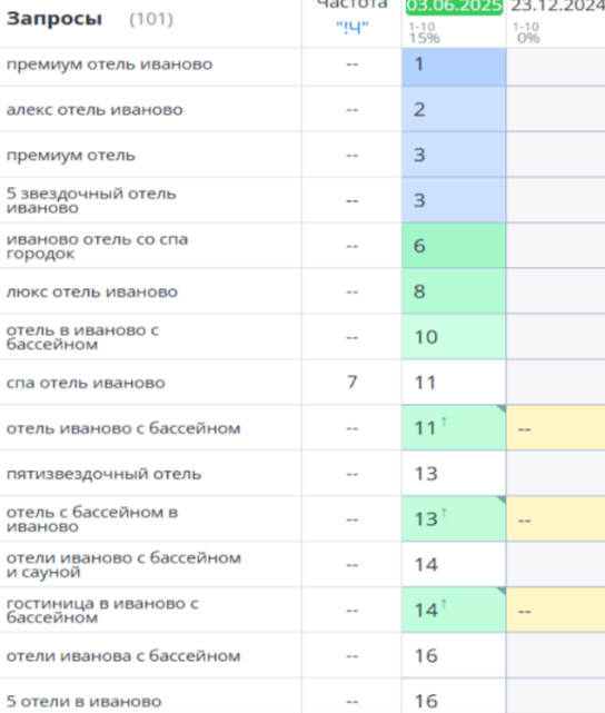 - Сформировано полное семантическое ядро с акцентом на высокочастотные и среднечастотные запросы: «отель Иваново», «пятизвездочный отель Иваново», «отель с бассейном Иваново» и др.