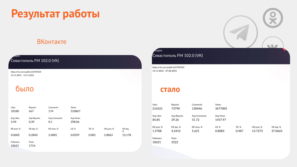 - Увеличить подписчиков ВКонтакте в 2,5 раза, увеличить охват просмотров ВК-клипов с 0 до 6 миллионов. Собрать сотни отзывов и благодарностей.