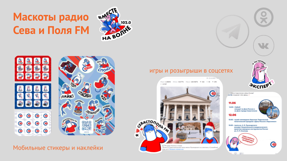 - Создала с дизайнером стикеры в тг, напечатала для раздачи. А маскот стал админом телеграм-канала радиостанции. Вся коммуникация в тг-канале с подписчиками идет от лица Севы FM. Также у маскотов есть собственные игры в тг, ВК и радиоэфире.