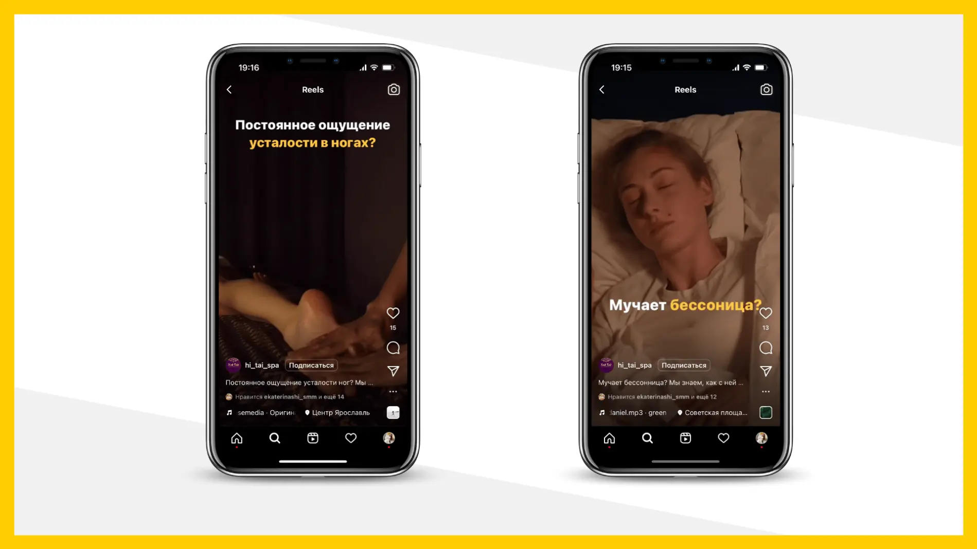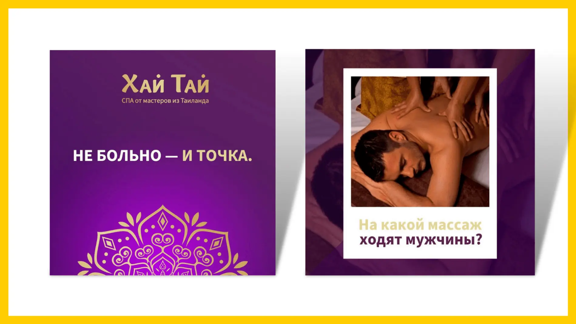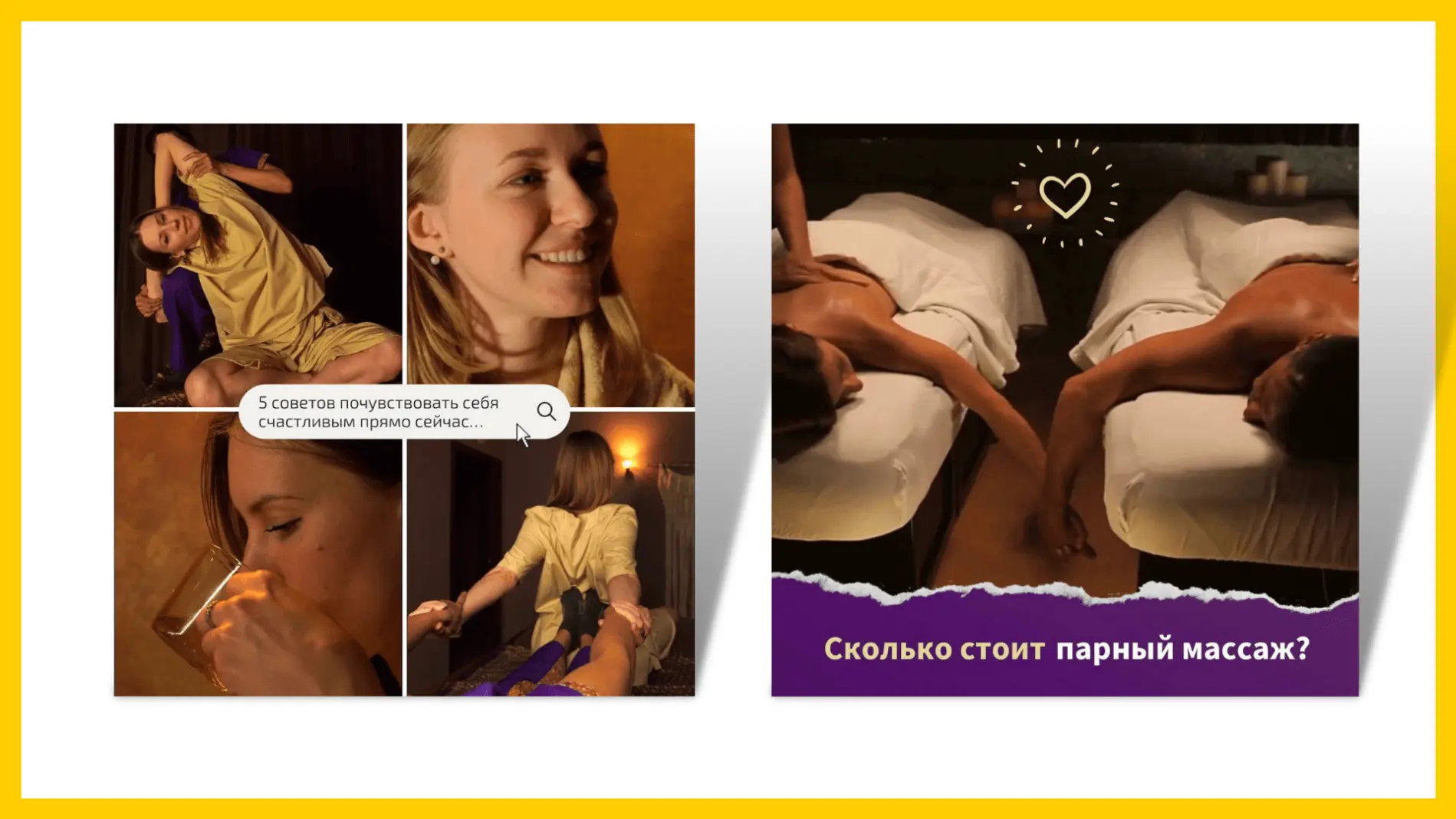 В ТЗ заказчику мы прописывали, что необходимо снять: фото/видео с интерьером, процессом массажа, мастерами, ощущениями и эмоциями после процедур. Так как архетип ЦА – влюблённый, необходимо работать через эмоции, ощущения, чувства. Также давали именные промокоды с приятными акциями. Этот вариант рекламных подач оказался самым конверсионным.