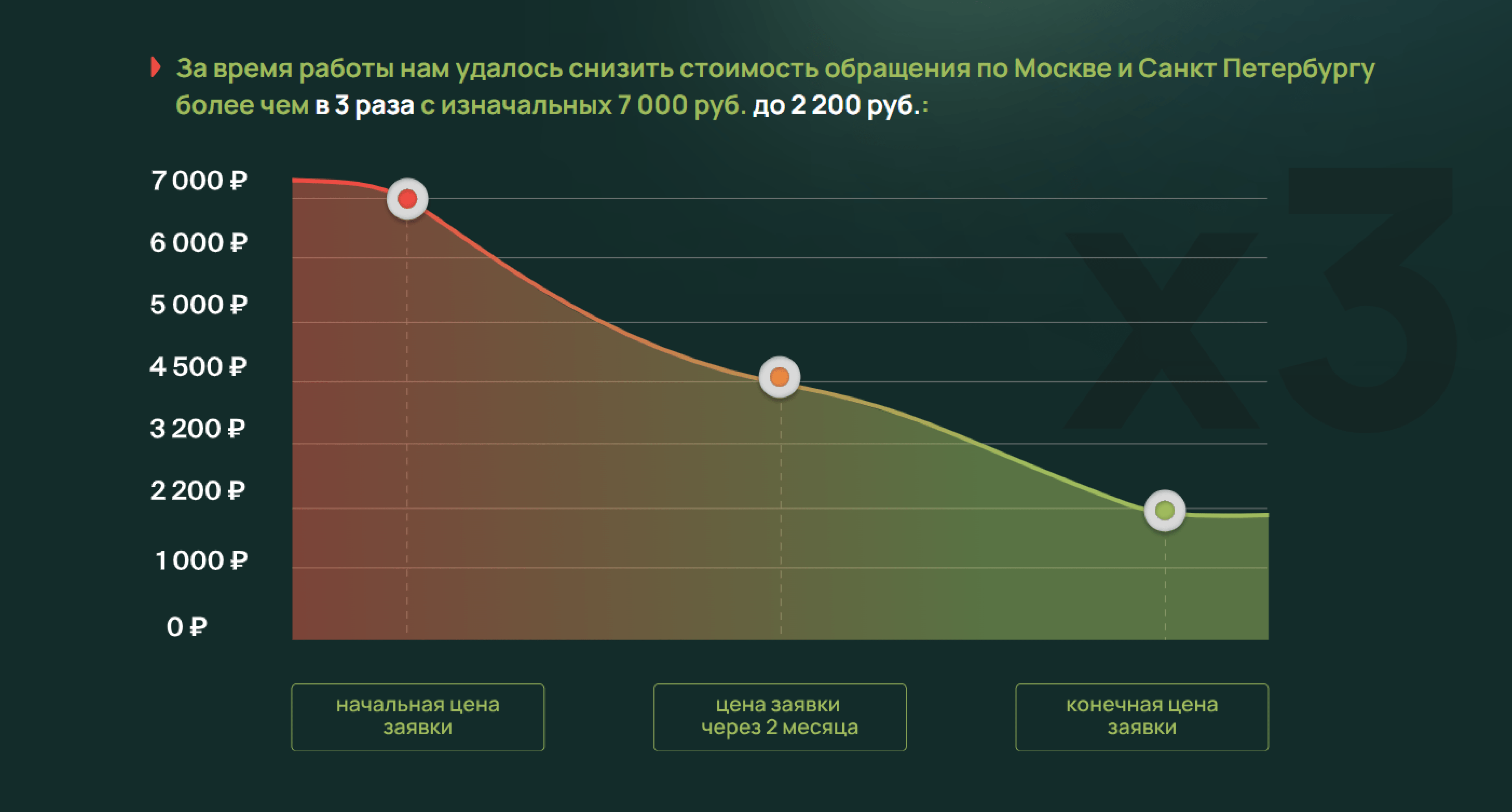 За время работы нам удалось снизить стоимость обращения по Москве и Санкт Петербургу более чем в 3 раза с изначальных 7 000 руб. до 2 200 руб.: