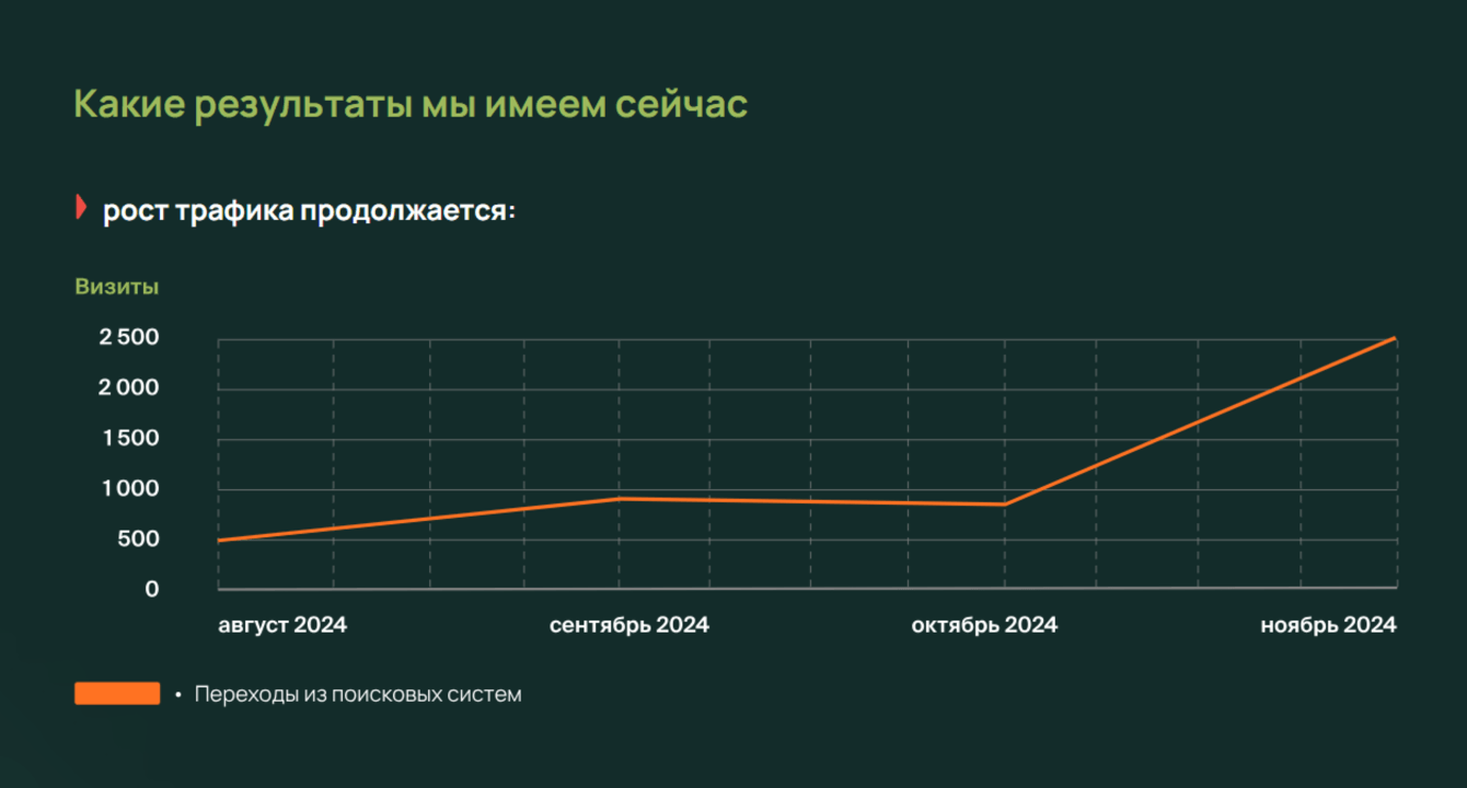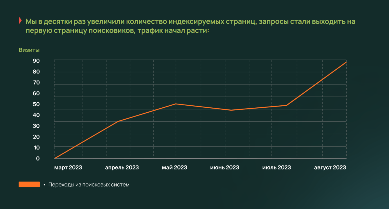 Мы в десятки раз увеличили количество индексируемых страниц, запросы стали выходить на первую страницу поисковиков, трафик начал расти: