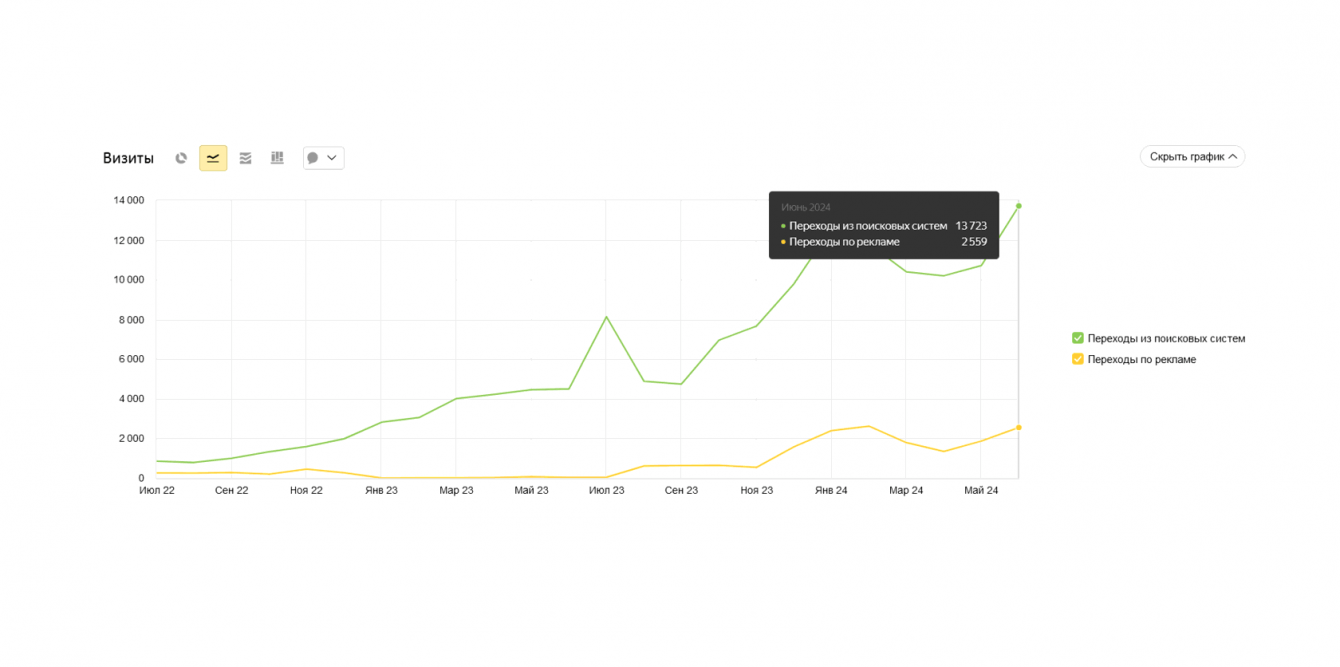 На настоящий момент сайт продолжает продвигаться в компании R52.RU и получает почти 14000 переходов из поисковых систем в месяц, что превышает показатели 2021 года в 140 раз.