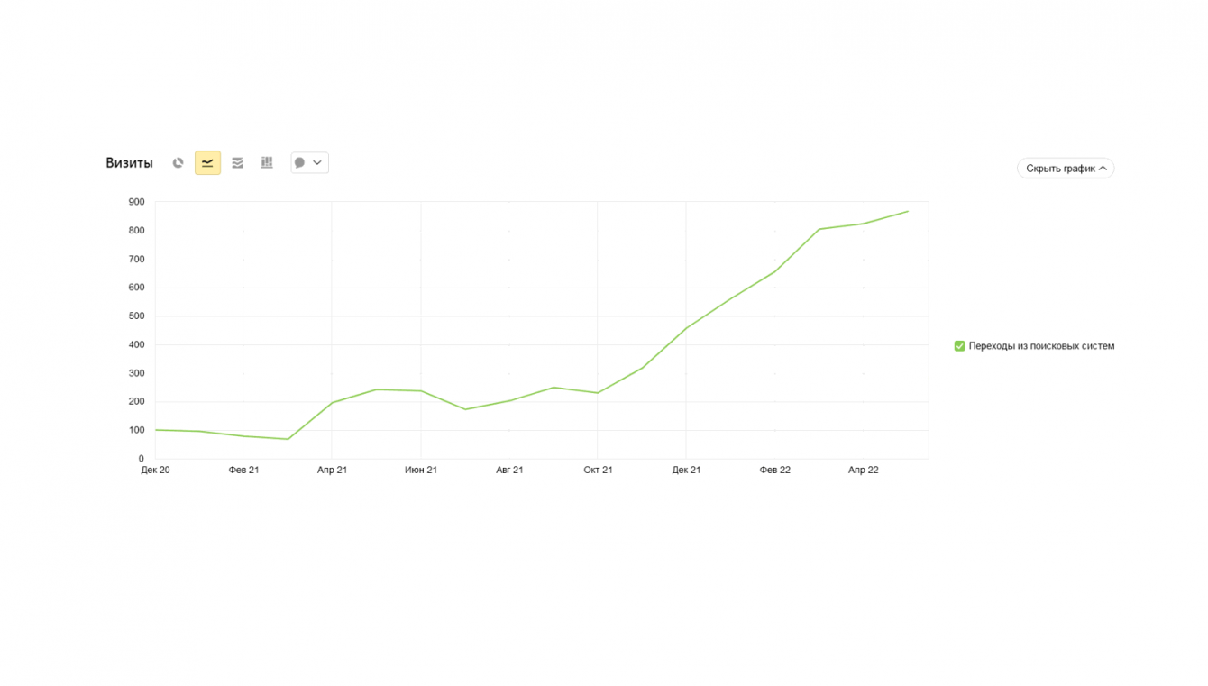 Спустя год, в марте 2022 было получено значение 805 переходов с органики (рост по отношению к начальным показателям более, чем в 8 раз), что на 60 процентов превышает установленный KPI проекта.