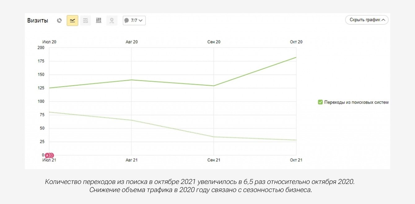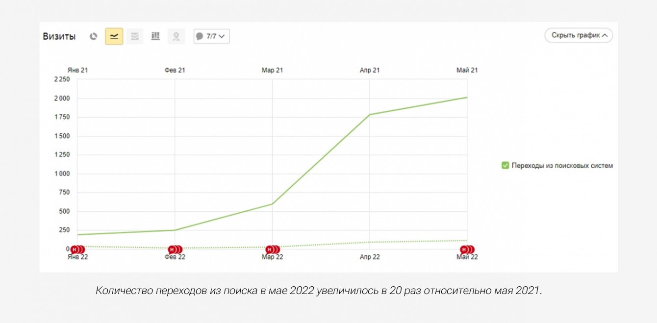 За 7 месяцев продвижения мы успели детально проработать каталог, страницы услуг и портфолио — 90% наполнения сайта, вывести сайт в ТОП-10 по 80% запросов из СЯ. Казалось бы, больше глобальных сео-работ не предвидится, но это не так.
