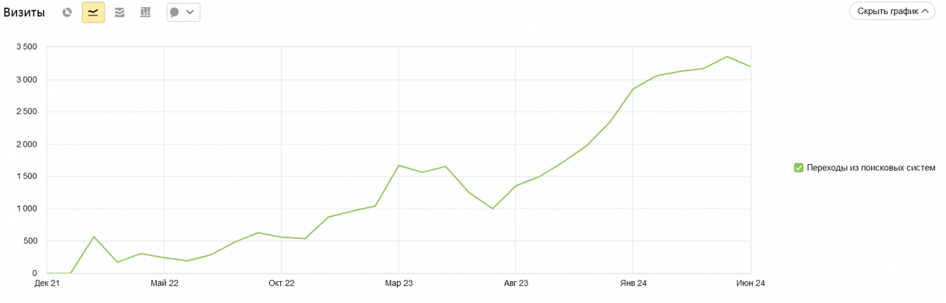 - К июню 2024 мы вышли на значение 3200 визитов из поисковых систем в месяц, а это уже рост на 1280%.