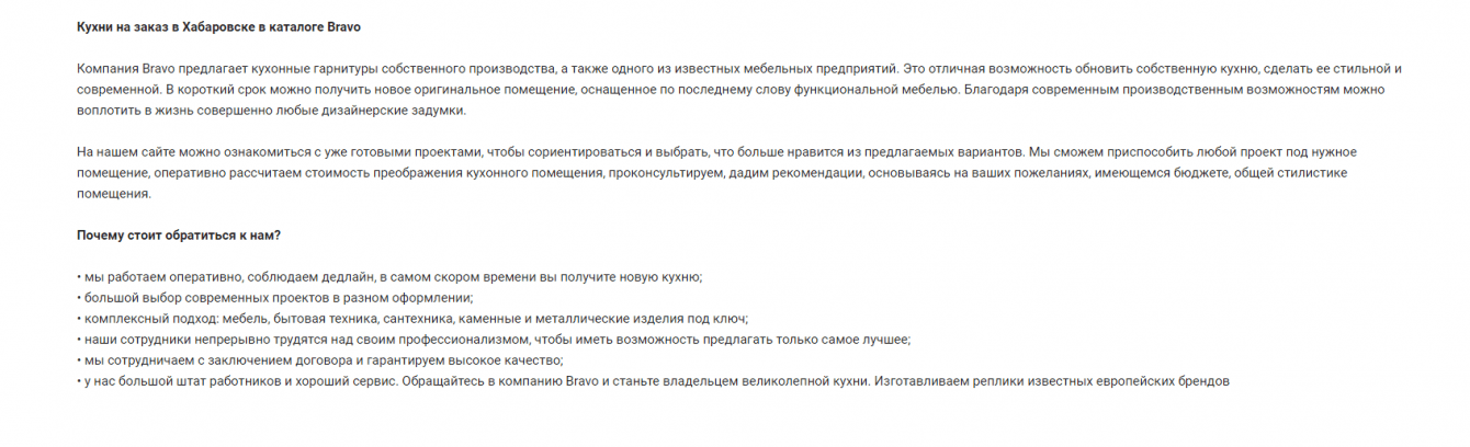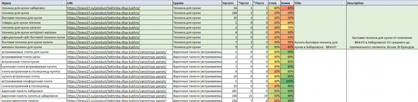 Собрали данные по поисковым запросам из Яндекс и Google на основании запросов подготовили структуру каталога. Распределили запросы по разделам каталога и сформировали контент-план для написания текстов, которые в последующем размещали на сайте клиента, а так же на трастовых площадках со ссылкой на сайт BRAVO.