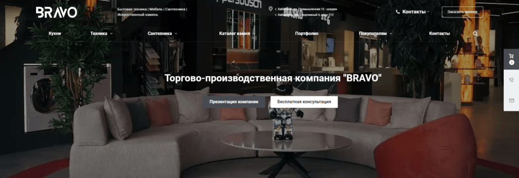 Компания BRAVO работает на рынке Хабаровска с 2008 года. Основные направления деятельности- производство мебели из искусственного и натурального камня, а так же поставки элитной бытовой техники. У компании имеется собственное производство и шоу-рум.