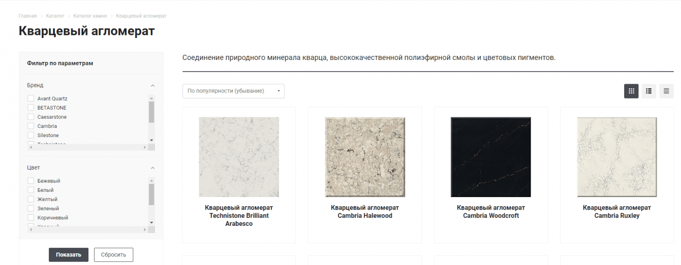 В процессе работы клиент обратил внимание на то, что его менеджерам приходится часто демонстрировать клиентам образцы камня и тратить время на отправку скриншотов в ватсап. Было решено выгрузить все имеющиеся позиции камня с сайтов поставщиков и залить в отдельный каталог на сайте. Таким образом менеджеру требовалось только отфильтровать камни по цвету, производителю и отправить ссылку клиенту.