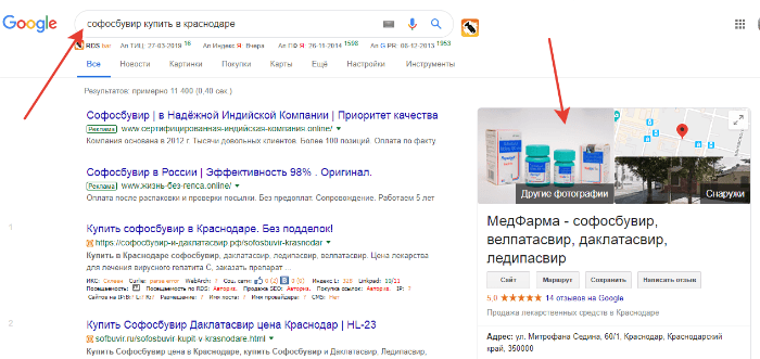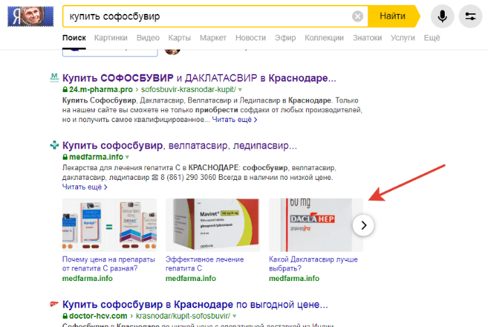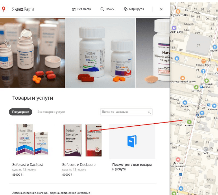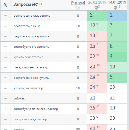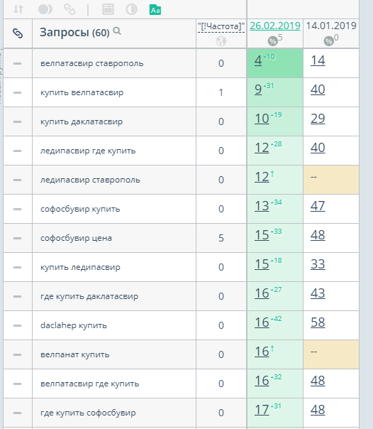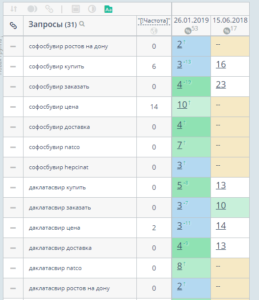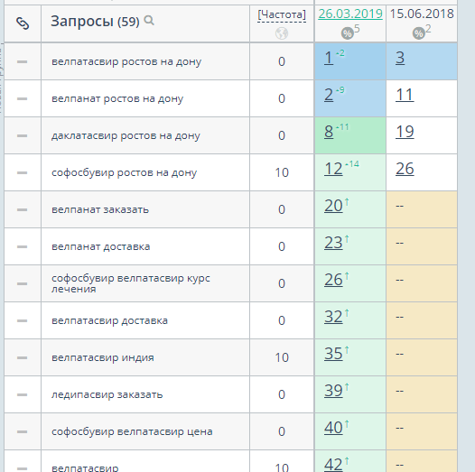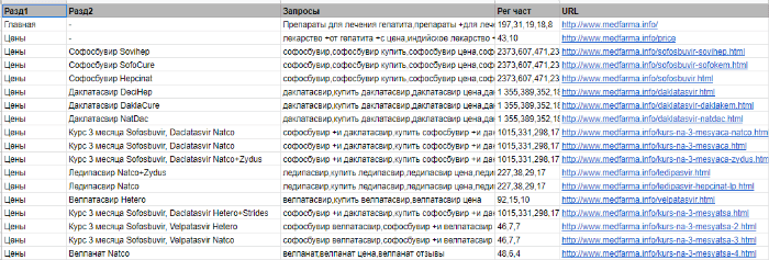 У проекта узкая ниша и небольшой каталог товаров. Мы собрали семантическое ядро по названиям препаратов и их производителям. Клиент подсказал, что чаще ищут не само название препарата, а действующее вещество: софосбувир, даклатасвир, велпатасвир и ледипасвир.