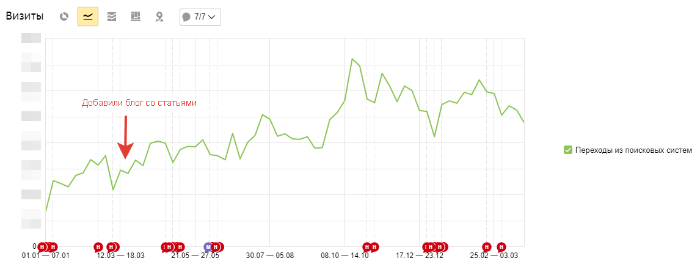Добавили раздел “Статьи” и приступили к его наполнению. Это дало свои плоды. Посещаемость и позиции выросли потому что:
