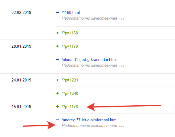 В Яндекс.Вебмастер видим следующую картину. Из поиска исключаются страницы с ЧПУ, а добавляются с параметром