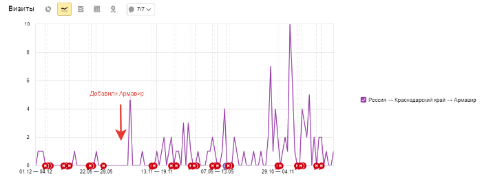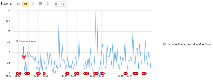 Параллельно с написанием статей, добавили страницы под небольшие города Краснодарского края. Большого прироста трафика не получили, но он хотя бы появился.