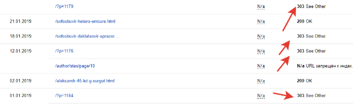 Проверили в Вебмастере. Действительно, страницы почему-то стали отдавать 303 код, а должен быть 200.