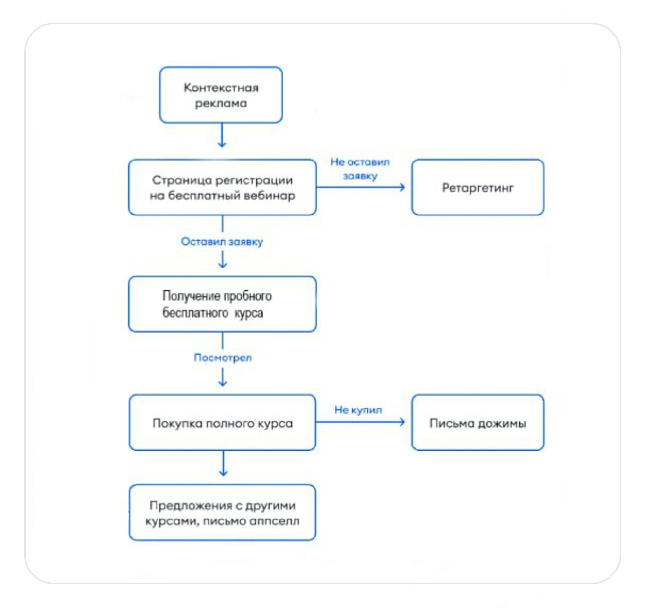 Человек кликает по рекламному объявлению и попадает на промостраницу бесплатного курса. Далее, в зависимости от его действий, ведем его разными путями. Если не зарегистрировался, но проявил интерес — настраиваем на него ретаргет по РСЯ и стараемся вернуть на сайт для регистрации. Если зарегистрировался — не бросаем, а заводим в соцсети или мессенджеры, и продолжаем взаимодействовать.