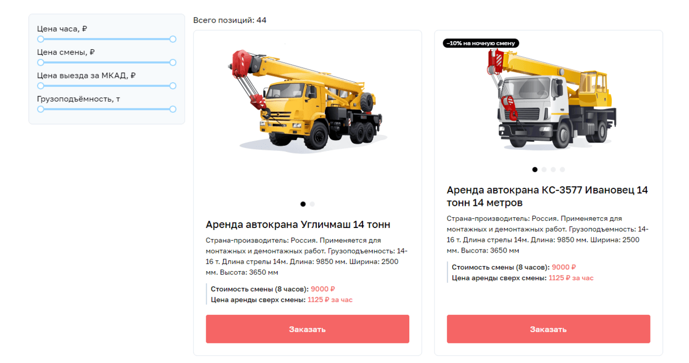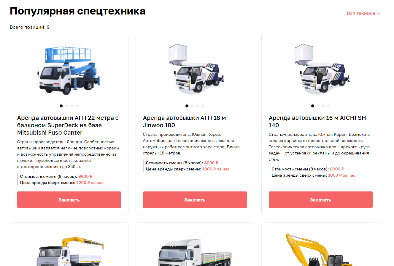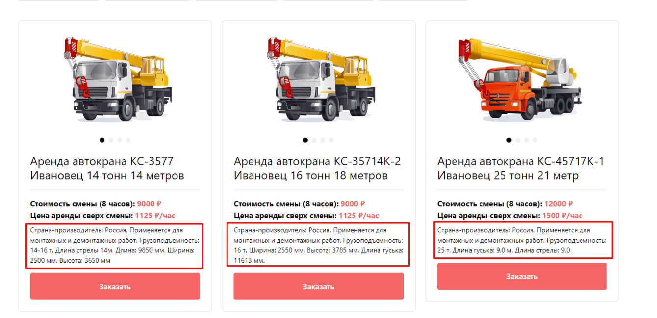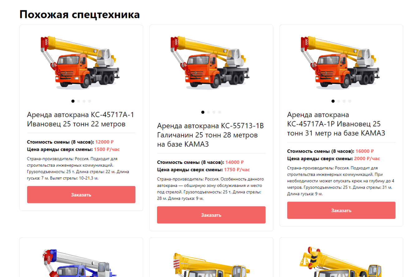 Как мы писали ранее, карточки спецтехники были пустые, они содержали лишь одну иконку с изображением, цену и калькулятор расчета стоимости с формой заявки. Мы доработали их до всех требований ТОП-10 “Яндекс” и Google: