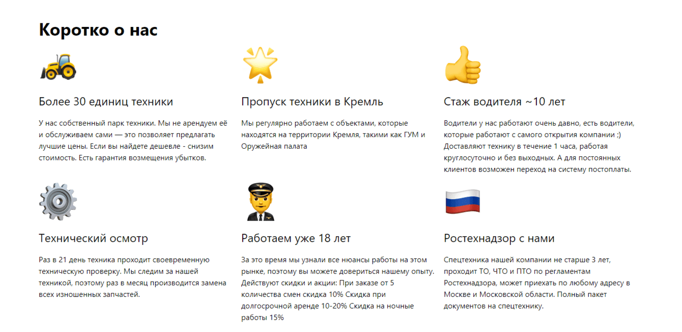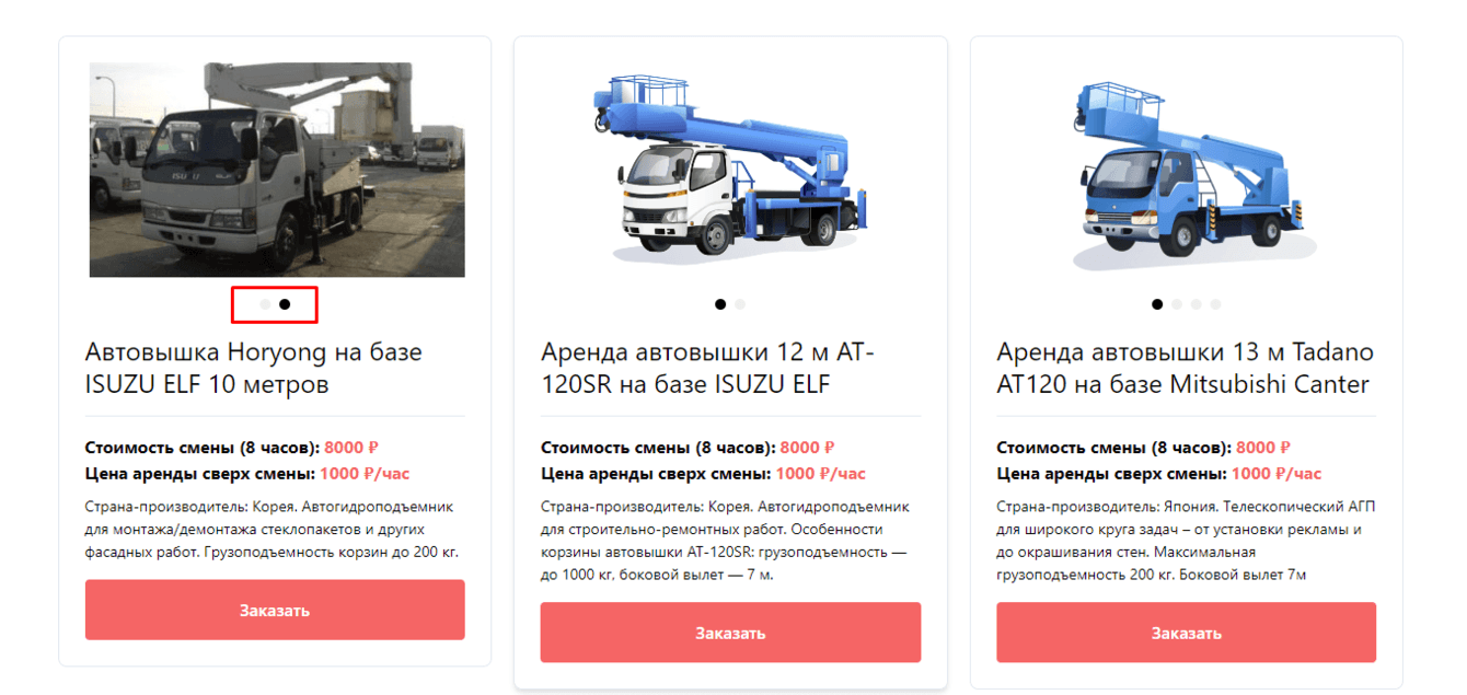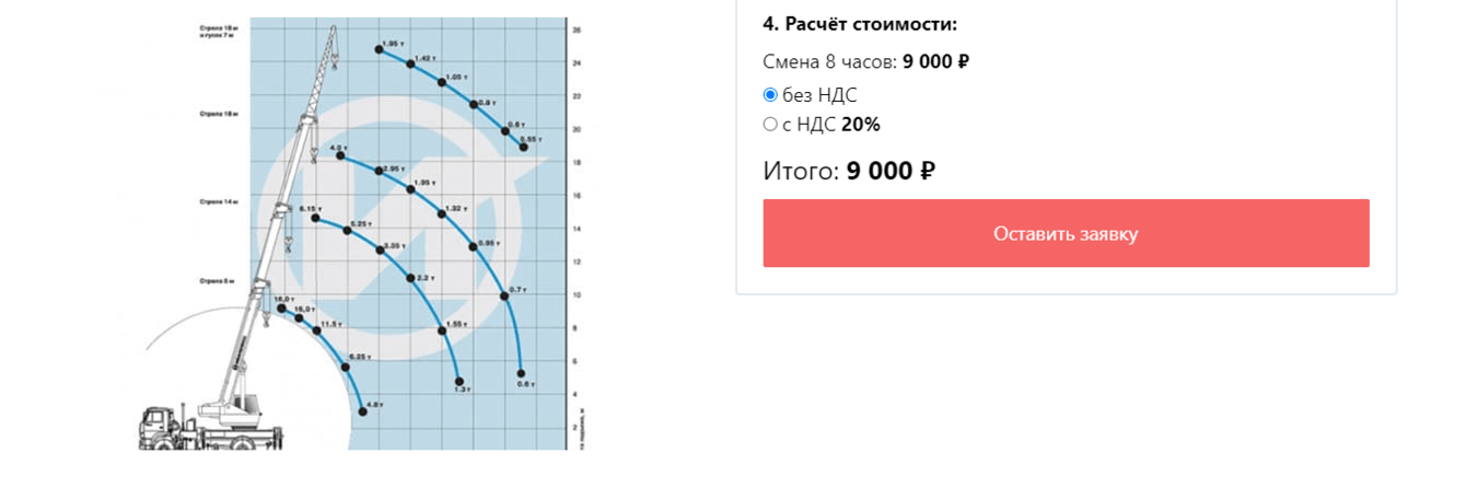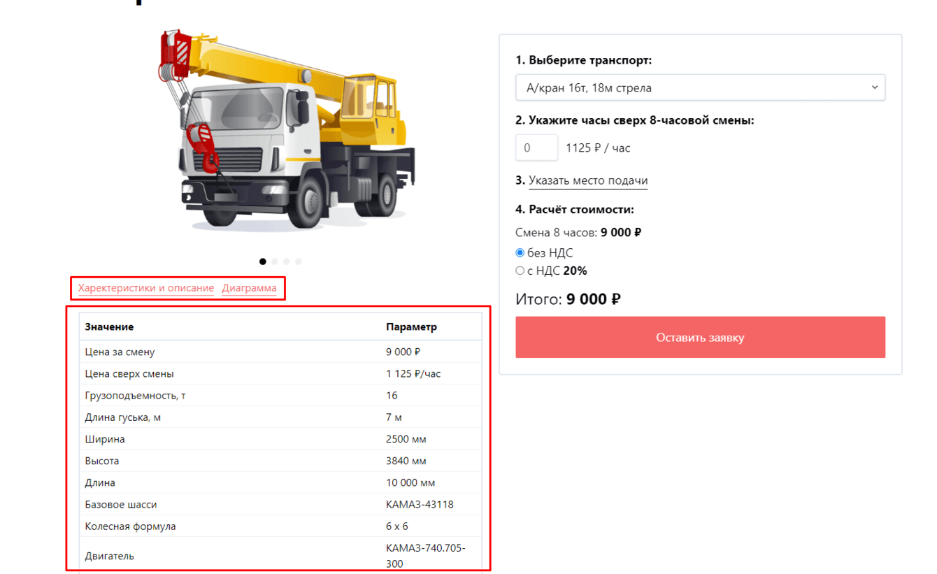 Как мы писали ранее, карточки спецтехники были пустые, они содержали лишь одну иконку с изображением, цену и калькулятор расчета стоимости с формой заявки. Мы доработали их до всех требований ТОП-10 “Яндекс” и Google: