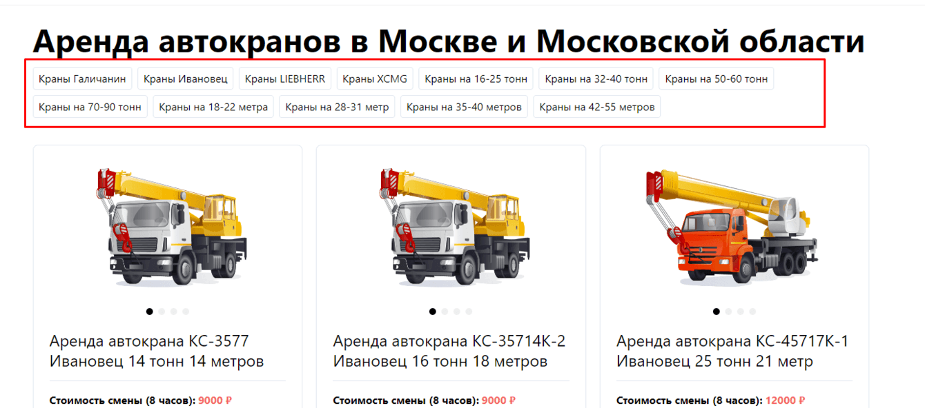 Также, в блоговом разделе сайта мы создали страницы под различные виды применения спецтехники, например “перевозка бытовок манипулятором”, “перевозка крупногабаритных грузов длинномером” и так далее.