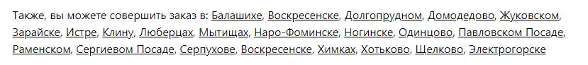 Для продвижения в Подмосковье мы разработали блоговый раздел сайта, создали и оптимизировали в нем страницы под каждый регион московской области. Чтобы повысить вес таких страниц, мы внедрили перелинковку с категориями и карточками техники.