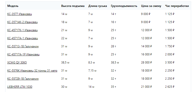 Добавили таблицы с краткими характеристиками и ценами на аренду.