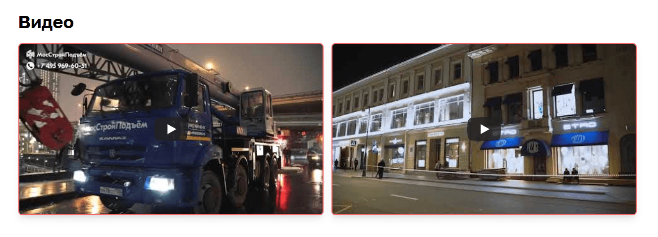 Добавлены видео-отчеты о работе спецтехники на категории. Видео также повышают доверие пользователей к компании и улучшают поведенческие факторы категорий.