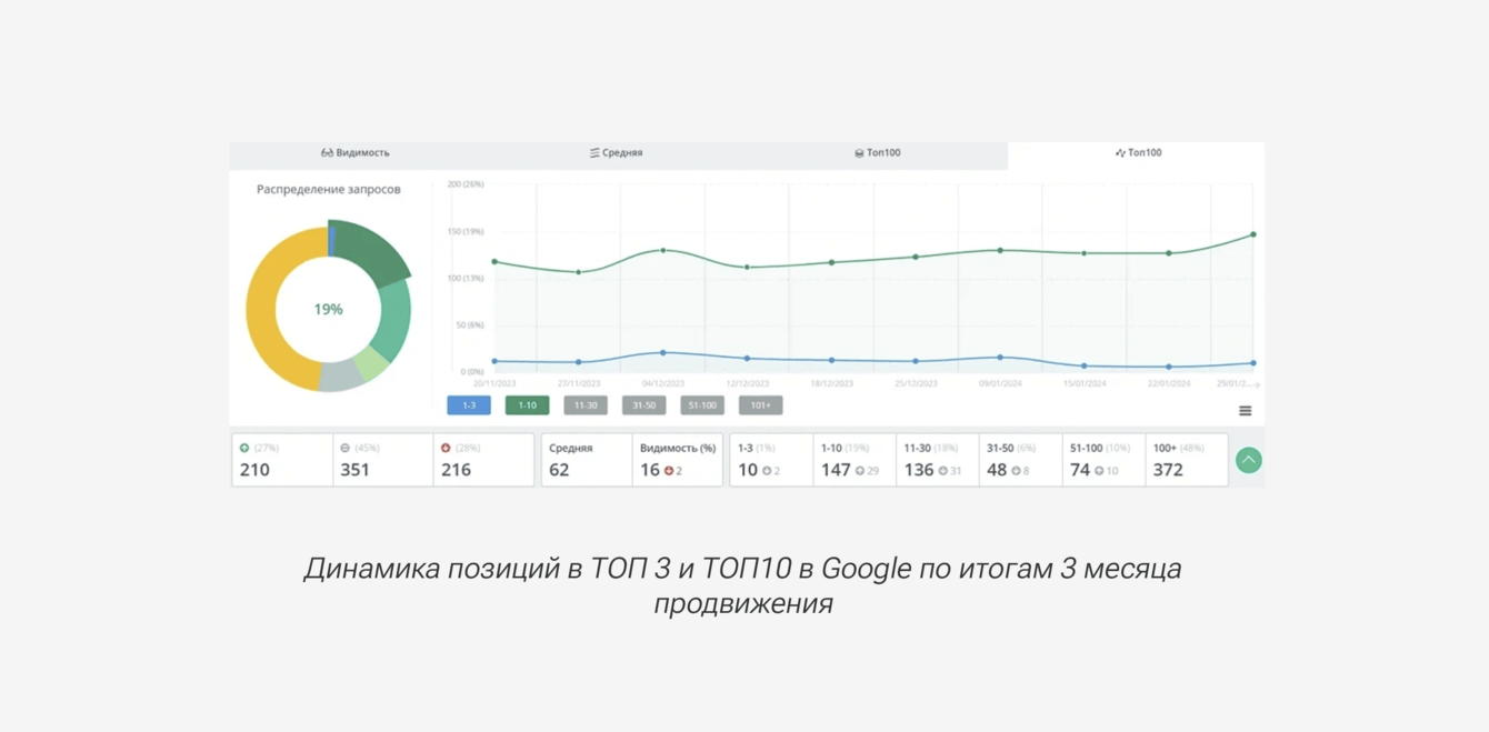 По итогам 3 месяца продвижения, благодаря качественным внешним ссылкам и устранению спама на посадочных страницах, позиции в Google вышли из стагнации. Количество запросов в ТОП-10 Google выросло с 15% до 19%