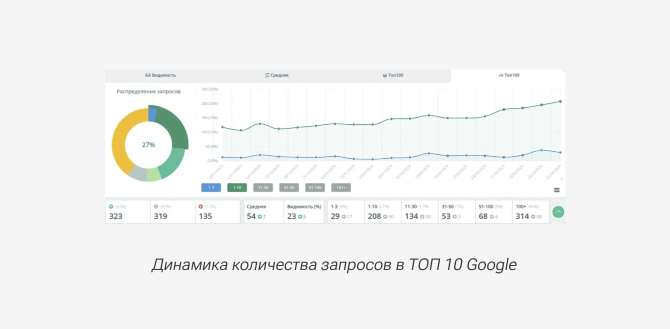 Количество запросов в ТОП-10 Google выросло с 15% до 27%, а в ТОП-10 Яндекса с 26% до 52%.