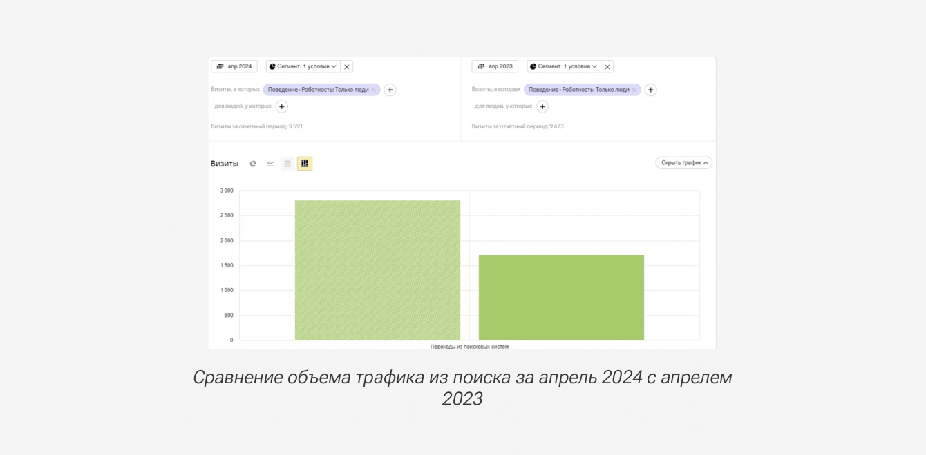 По итогам 6 месяцев продвижения объем трафика на сайт вырос в 2 раза по сравнению со стартом работ, но, так как бизнес сезонный, и в апреле начался сезон, то корректнее было бы сравнивать текущий год с прошлым.