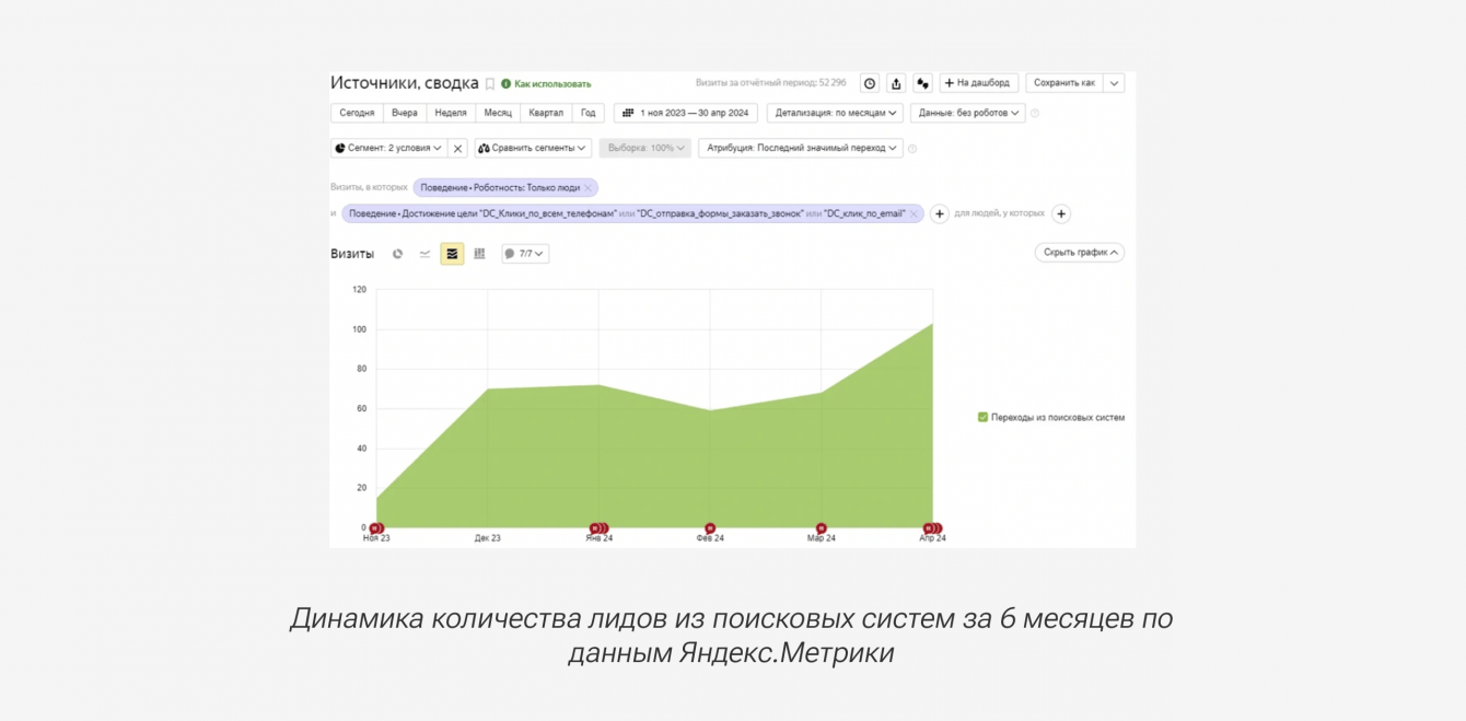 Динамику количества лидов мы отслеживали через достижения целей в Яндекс.Метрике, и по нашим данным количество лидов в апреле 2024 относительно декабря 2023 (в ноябре были заведены не все цели) выросло на 47%.