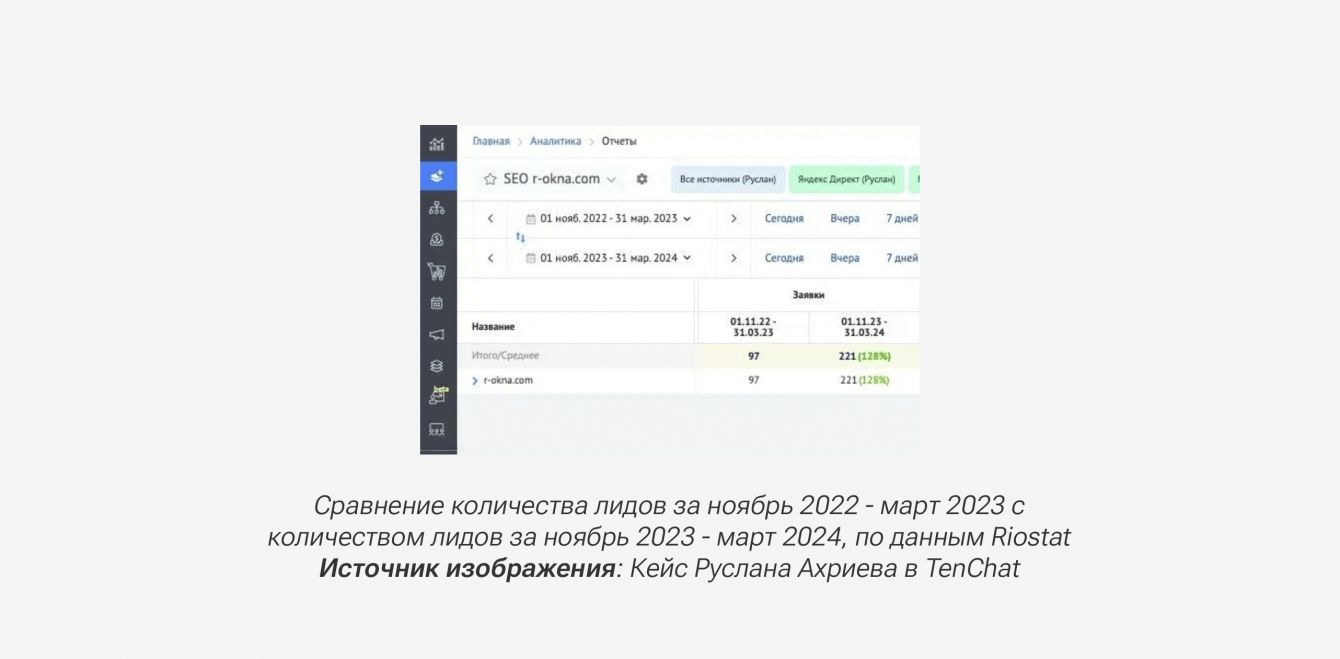 Клиент же отслеживал количество лидов через сервис Roistat и даже написал свой отзыв о нашей работе на своей странице в TenChat (https://tenchat.ru/media/2201108-kak-sekonomit-milliony-rubley-na-reklamnyye-raskhody-cherez-seoprodvizheniye).