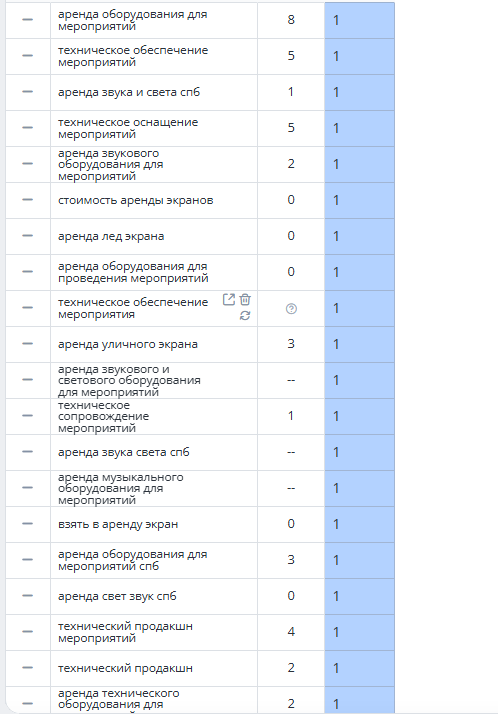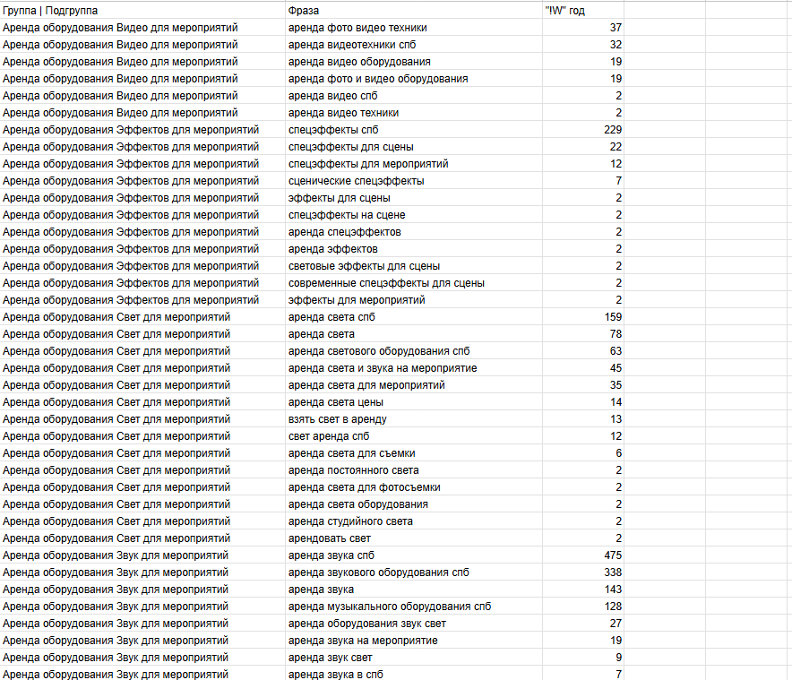 Составили семантику из 300+ запросов, включая высокочастотные ("техническое обеспечение мероприятий", "аренда звука для концертов") и низкочастотные ("студия для трансляций в Санкт-Петербурге"). Кластеризация проводилась по категориям.