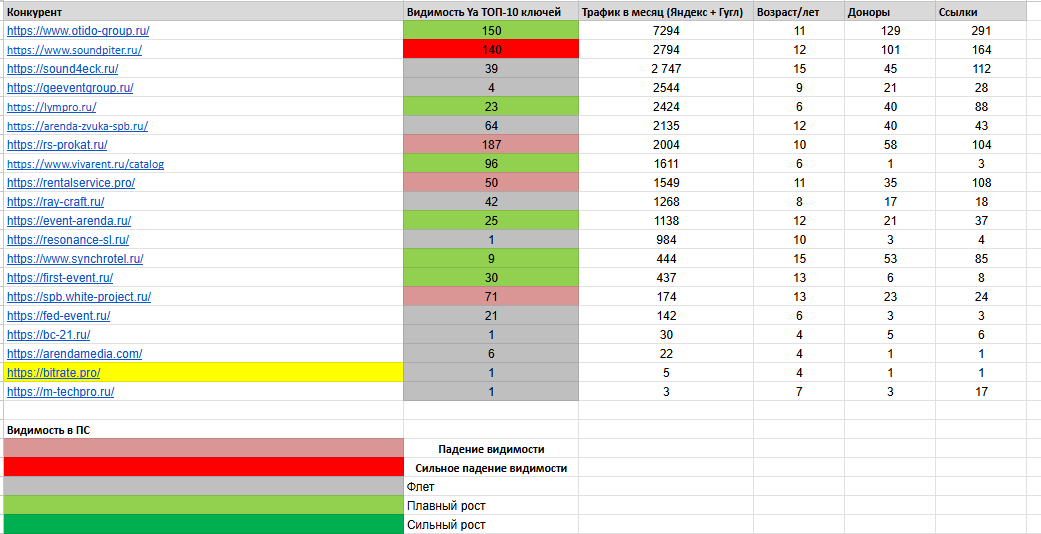 Сайт https://bitrate.pro/ предоставляет услуги технического продакшна мероприятий, аренды оборудования для событий (от корпоративов до фестивалей), онлайн-трансляций в HD и создания видеоконтента в студии с дополненной реальностью. Основная цель: вывести запросы, связанные с арендой оборудования, техническим обеспечением мероприятий и трансляциями, в топ Яндекса и Google, увеличить поток органического трафика и повысить конверсию в заявки. Целевая аудитория — организаторы событий, продюсеры и компании, которым нужны профессиональные решения для мероприятий в Санкт-Петербурге.