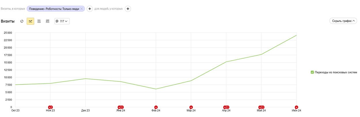 Общий трафик из поисковых систем увеличился с 7 482 до 24 117 визитов в месяц.