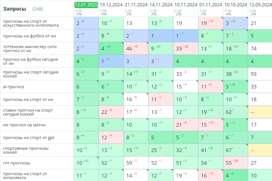 - Составлено полное семантическое ядро, включающее как высокочастотные, так и низкочастотные запросы: «прогнозы на спорт», «прогнозы от ИИ», «ставки на спорт», и др.