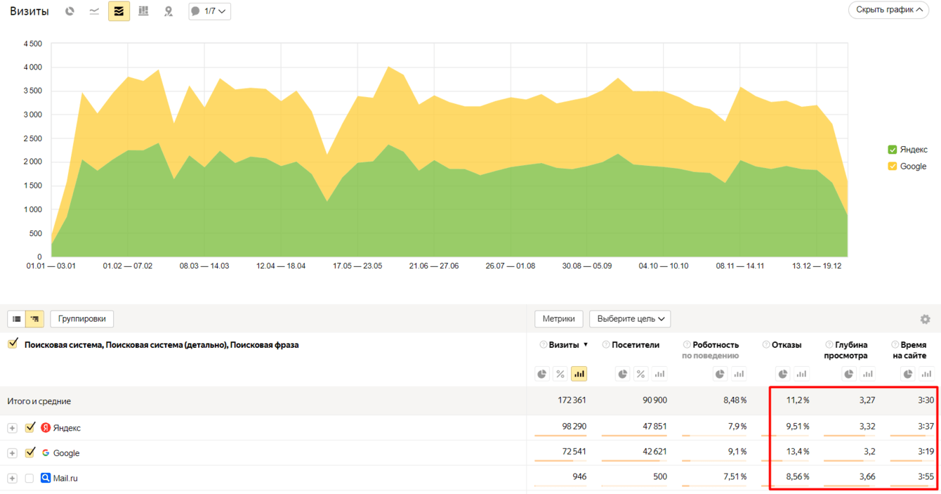 На последнем скрине видно, что из поиска приходит качественный трафик с отличными поведенческими показателями: отказы на уровне 11%, глубина просмотра более 3,2 страниц, время на сайте 3,30 минут.
