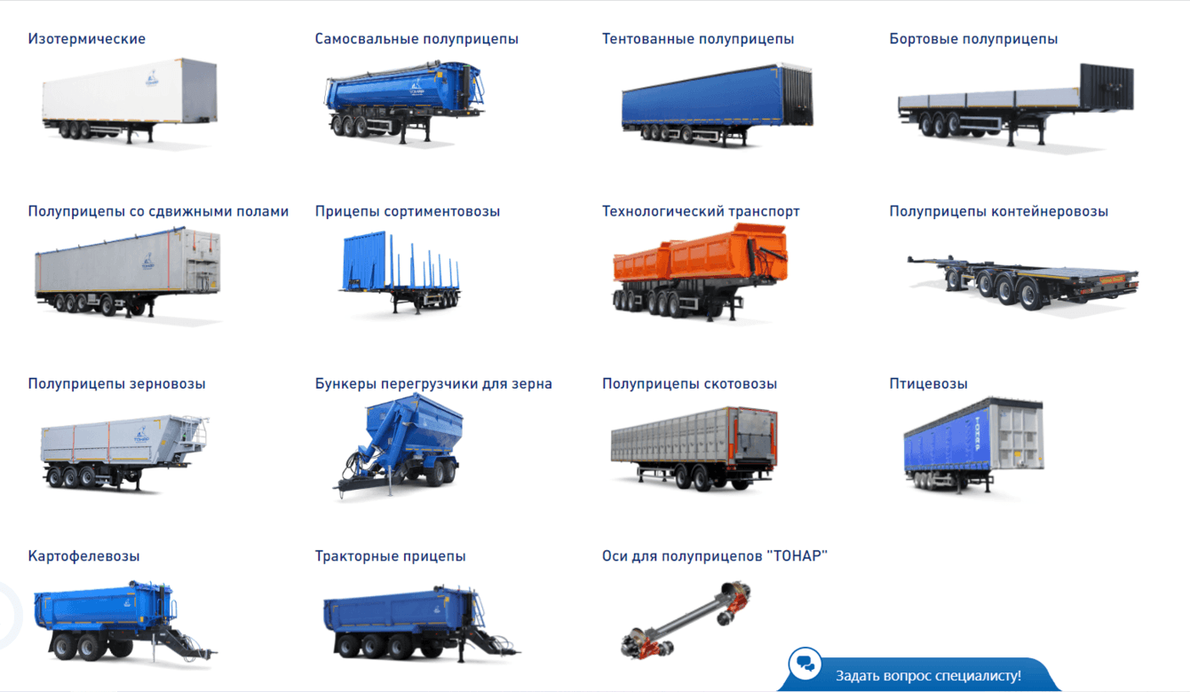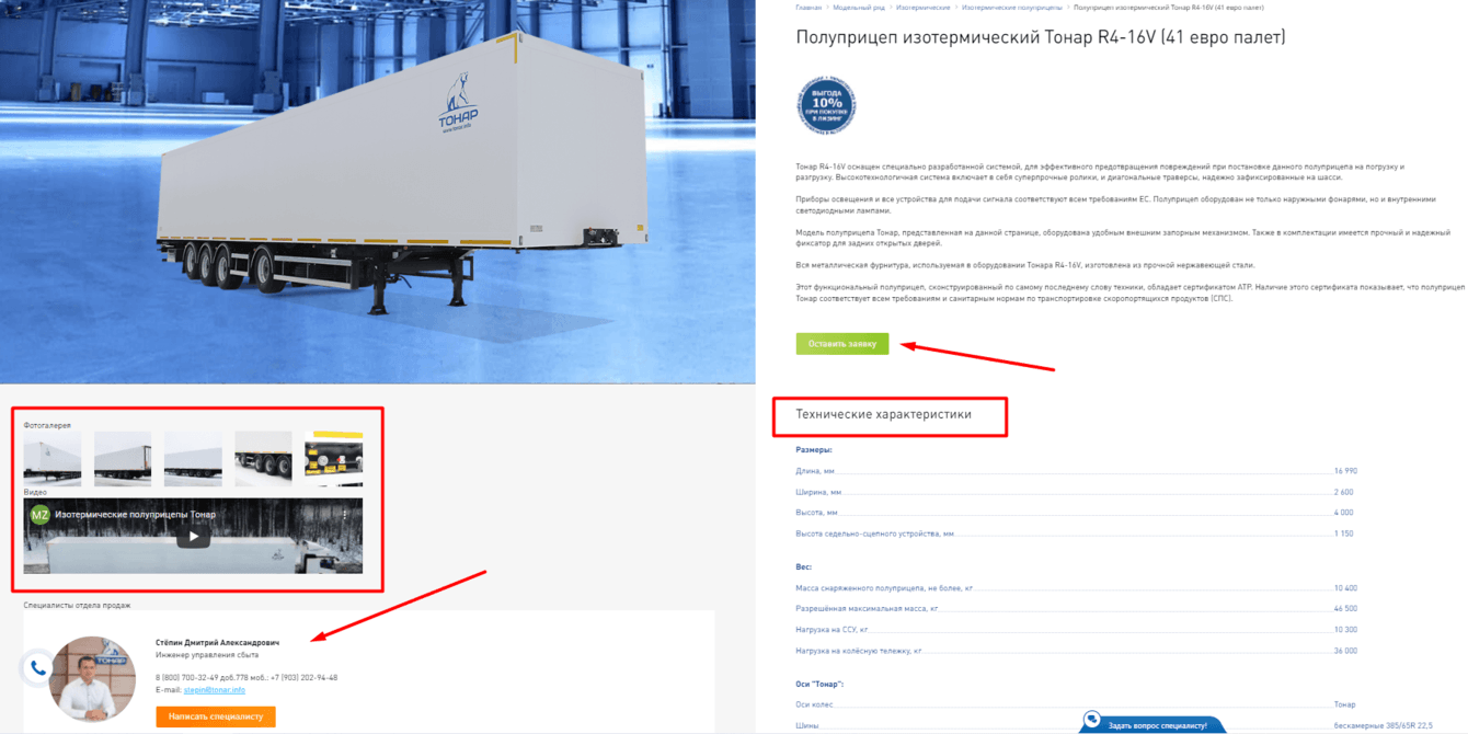В рамках работ по продвижению сайта, сделали правильную структуру сайта - под каждый вид полуприцепов был сделан свой раздел, который в свою очередь содержит подразделы по типам. На страницы всех разделов были написаны seo-тексты и в них внедрена перелинковка. Были досконально проработаны карточки товара, под требования поисковых систем: каждая карточка содержит несколько фотографий продукции, её видеообзор, есть подробное описание и технические характеристики каждого полуприцепа, внедрена форма обратной связи и контакты менеджера, который может проконсультировать именно по данной модели.