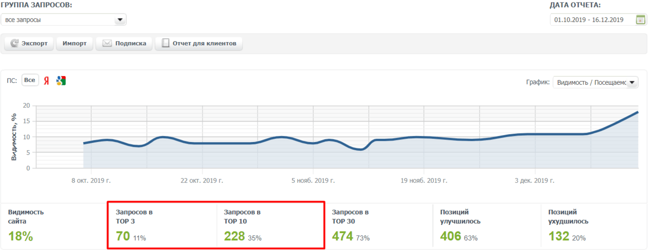 Из скринов ниже видно, что за первые 3 месяца работ сайт быстро начал расти по позициям и по итогам 19 года имел в ТОП-3 уже 70 запросов и 228 в ТОП-10.