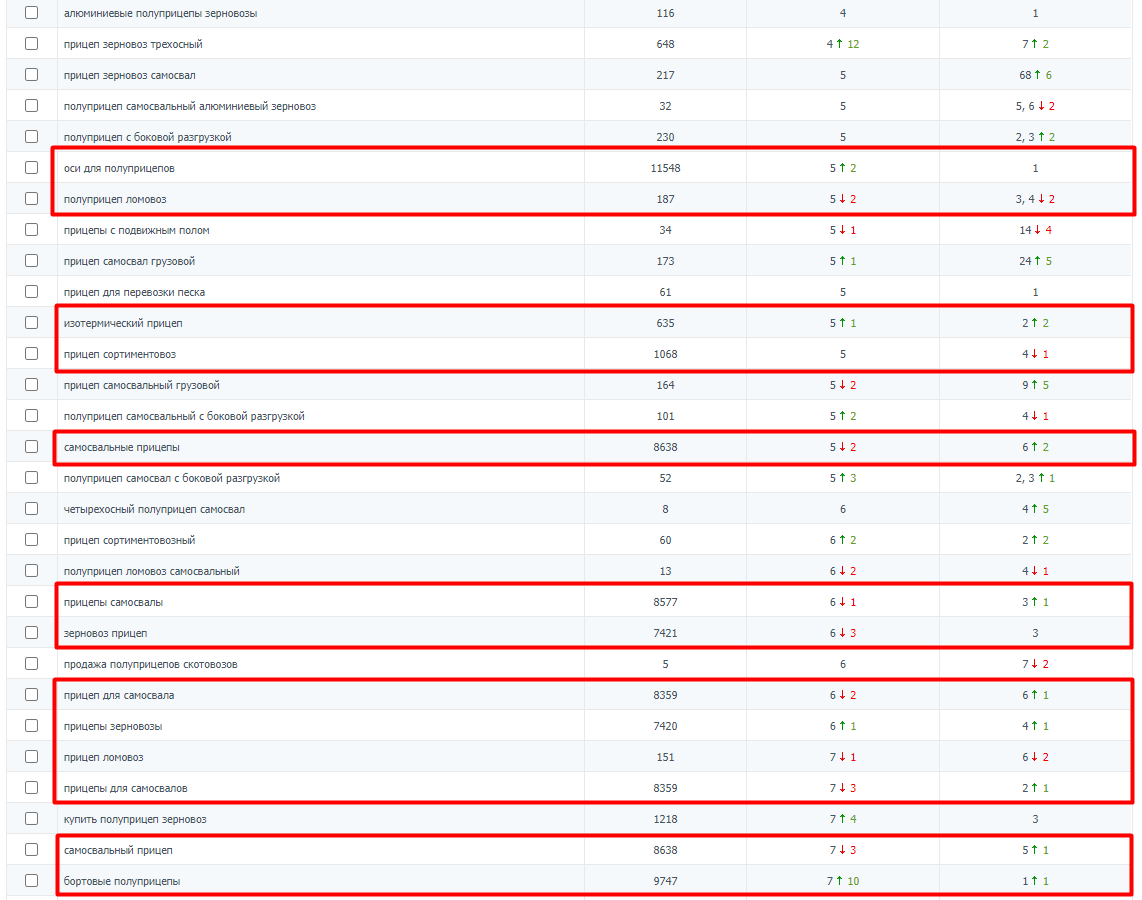 Но главная задача была закрепиться на высоких позициях в Яндексе и Гугле по основным видам продукции, эти запросы в большинстве своём являются СЧ и ВЧ, конкуренция по ним очень высокая, но несмотря на это они стабильно находятся в числе первых 10 позиций в обоих поисковых системах. Хотелось бы выделить такие фразы как: оси для полуприцепов, самосвальный прицеп, бортовые полуприцепы, прицепы зерновозы, прицеп сортиментовоз, изотермический прицеп, полуприцеп ломовоз и т.д.